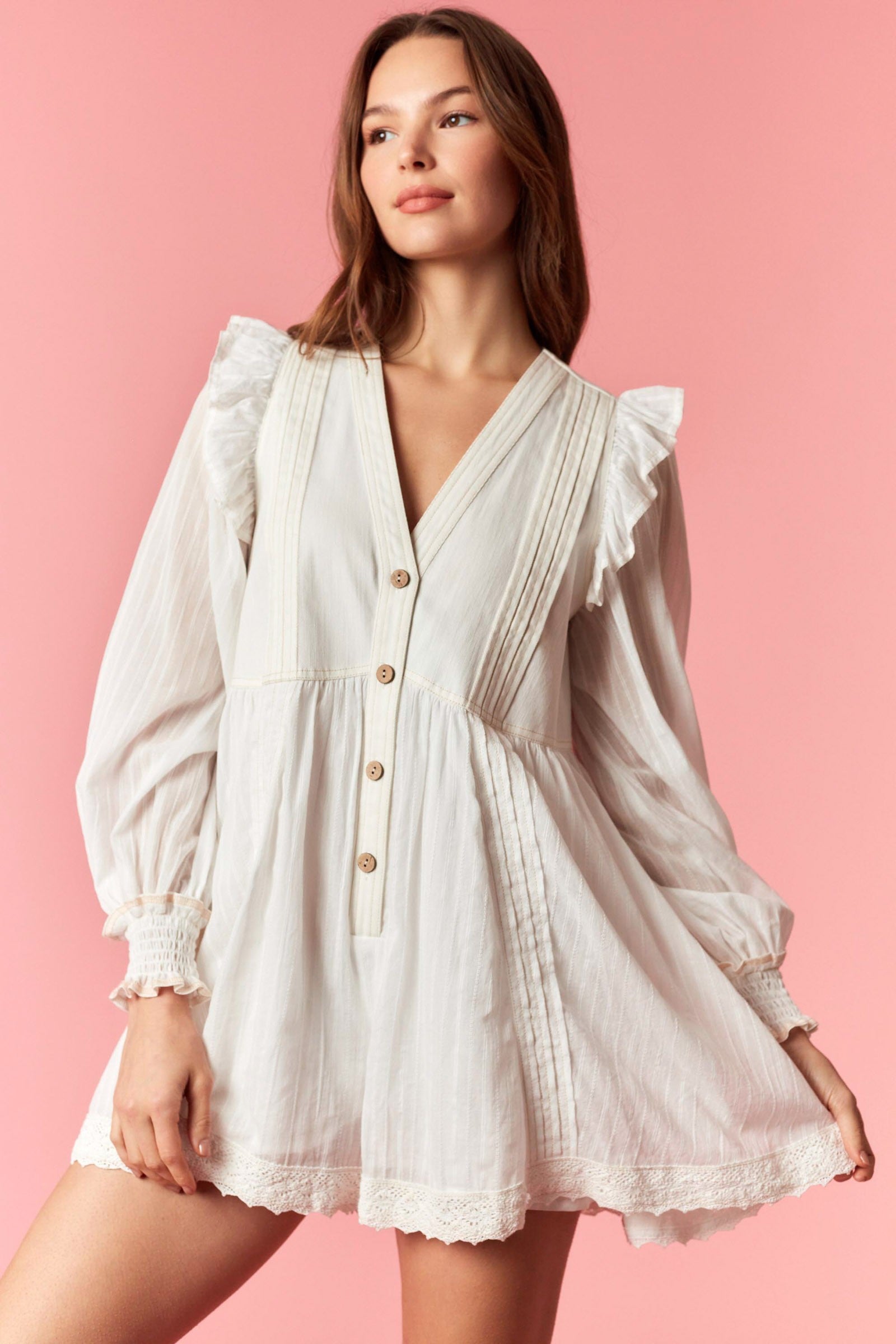 Radiate romantic, high-end boutique appeal with this dreamy flare romper, featuring feminine ruffled bubble sleeves, sophisticated pintuck pleats, and a delicate lace-trimmed hem for an effortlessly elevated aesthetic.Color: Creamy whiteFabric: 100% cottonBust - 39" LargeSizing: Fits up to - size...