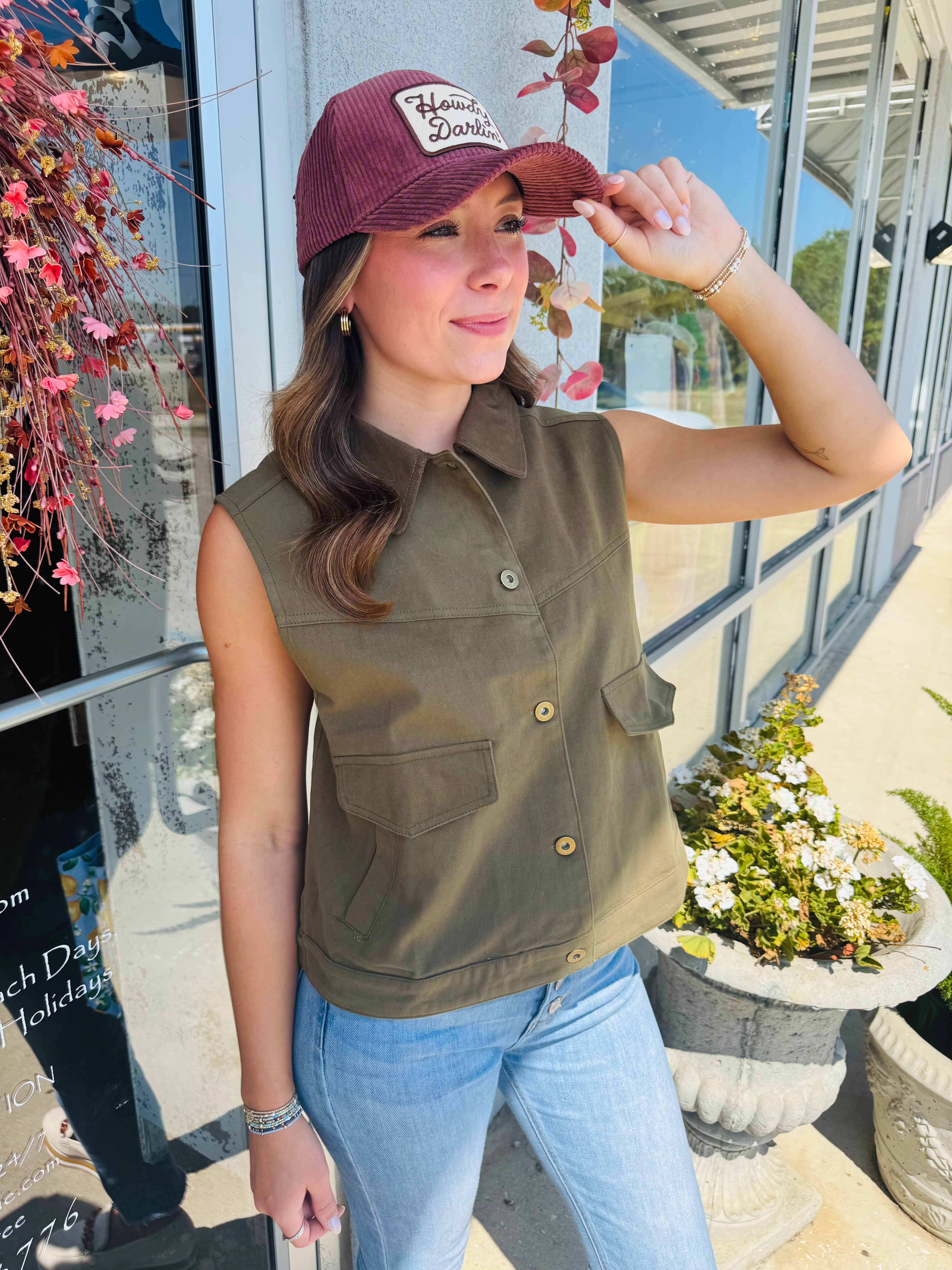 • Washed Cotton Button Down Casual Vest - Collared - Side Pockets