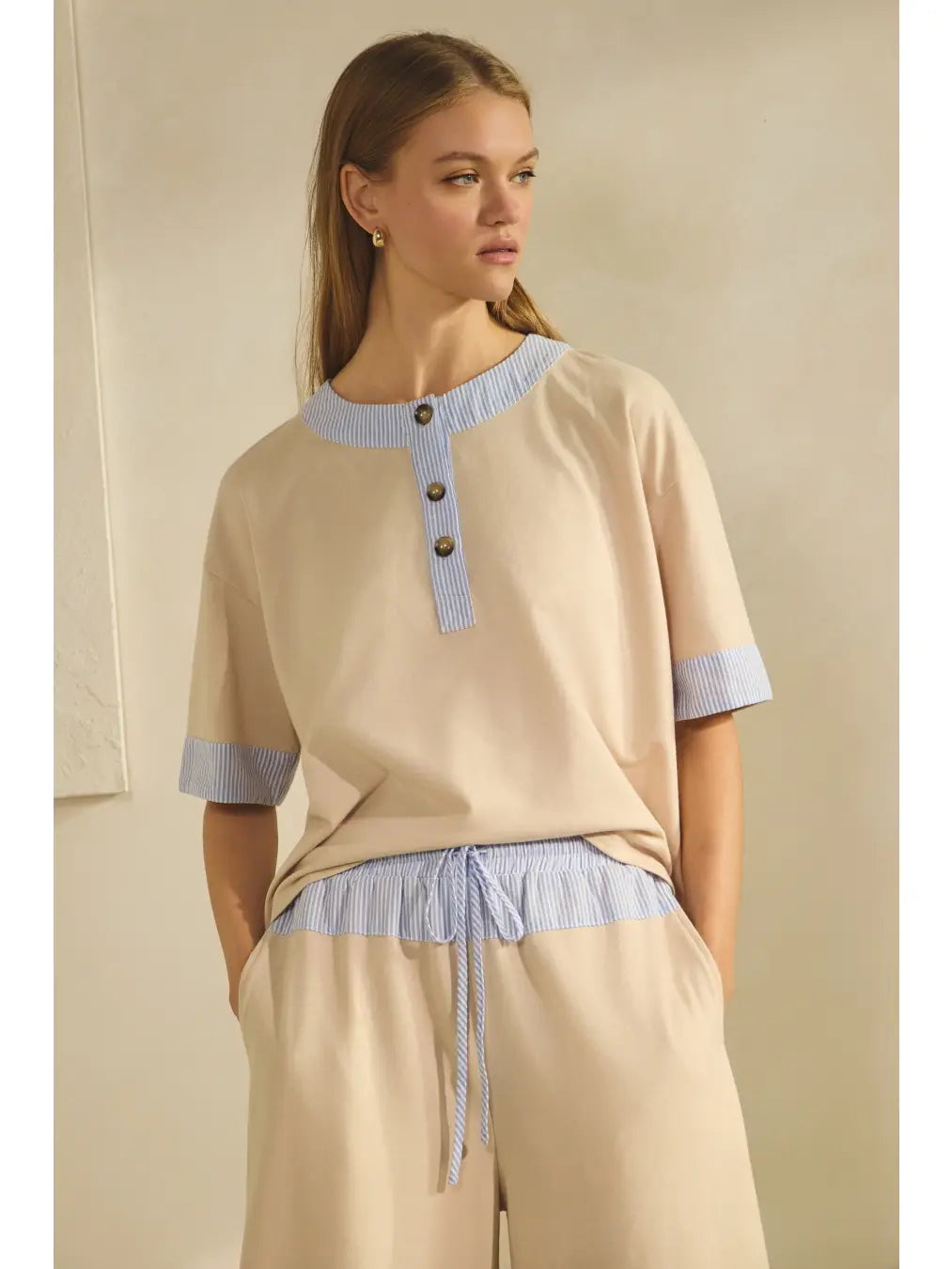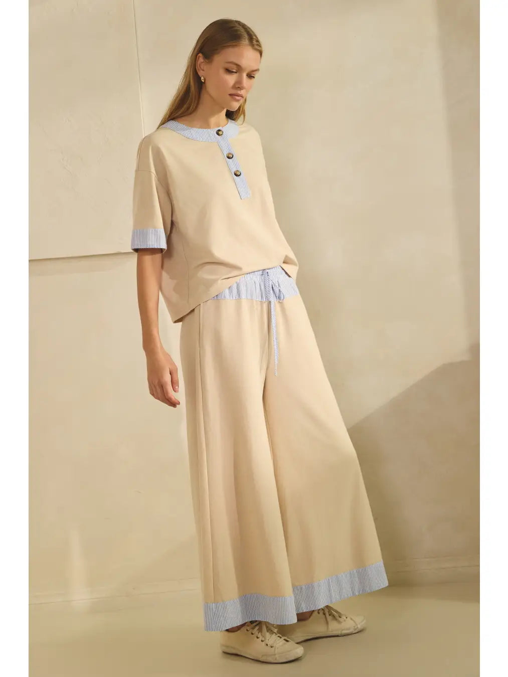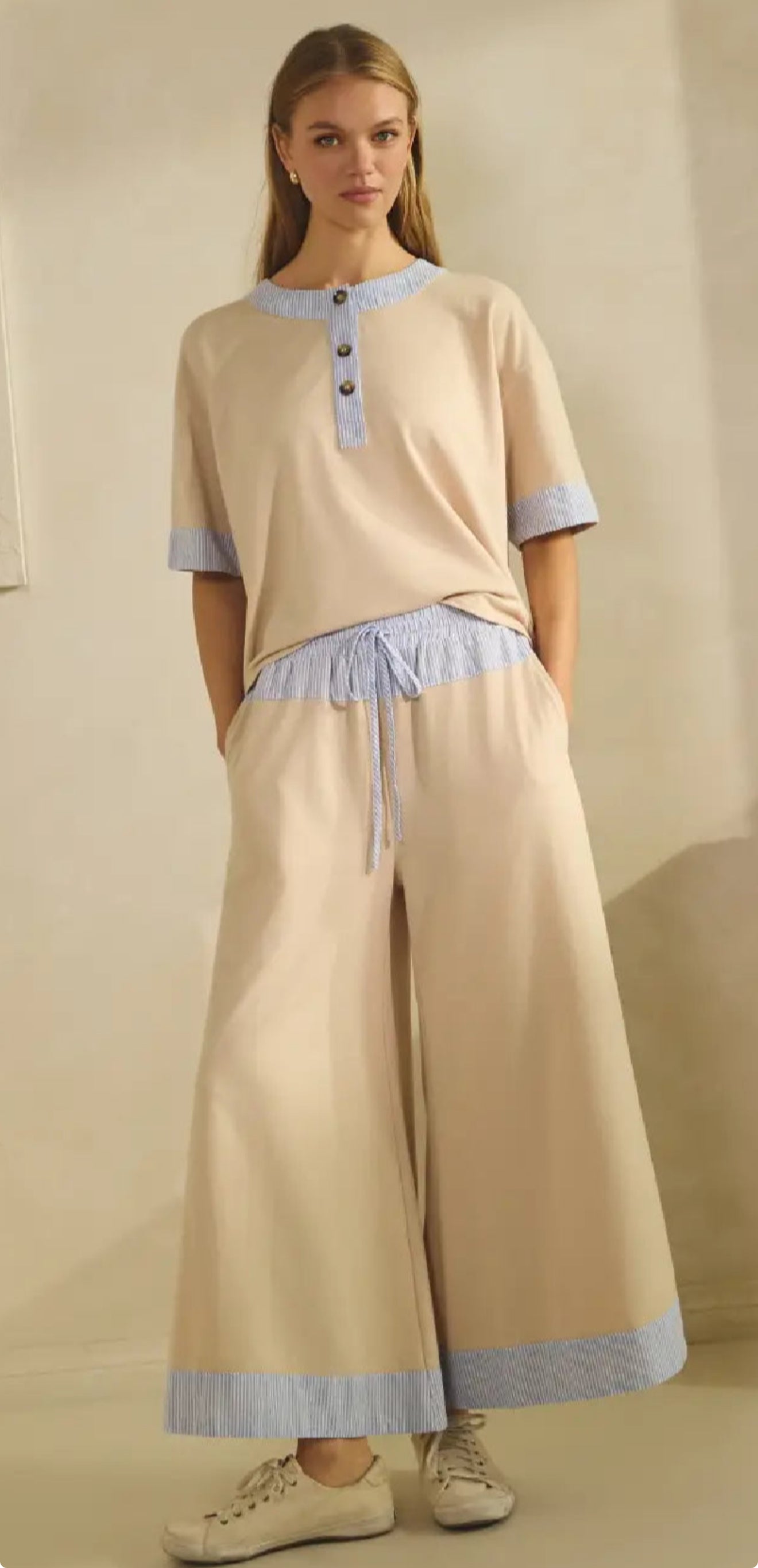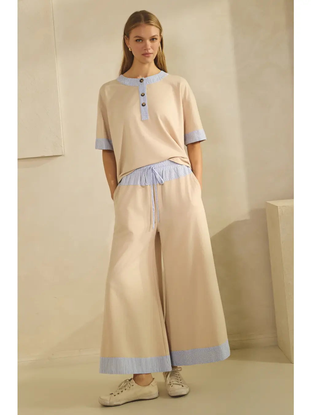 Seersucker Contrast-trim henley top with short sleeves and wide-leg pants with an elastic waistband and contrast hem panels.