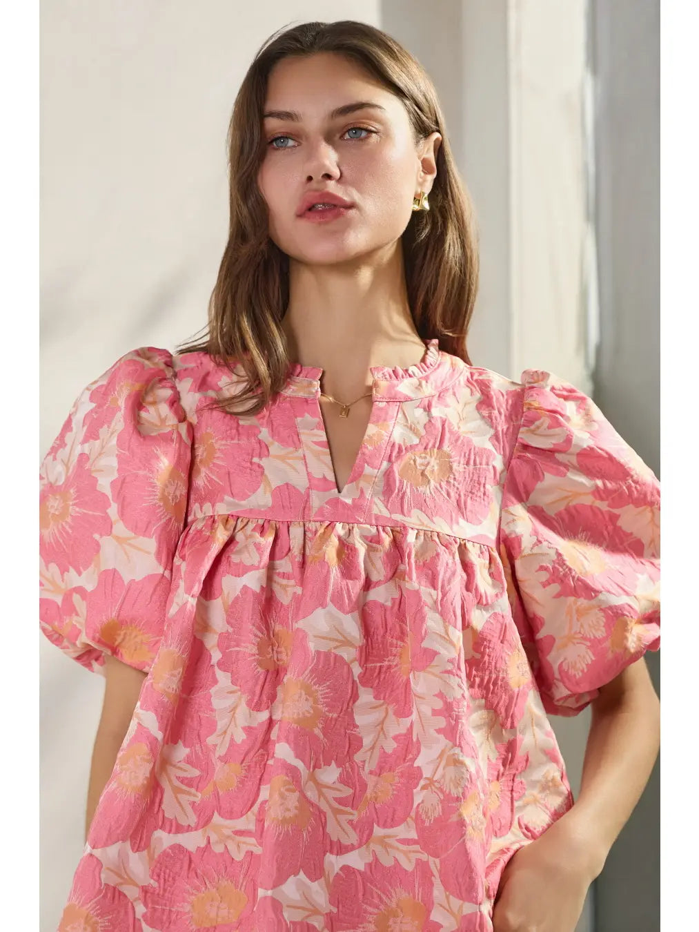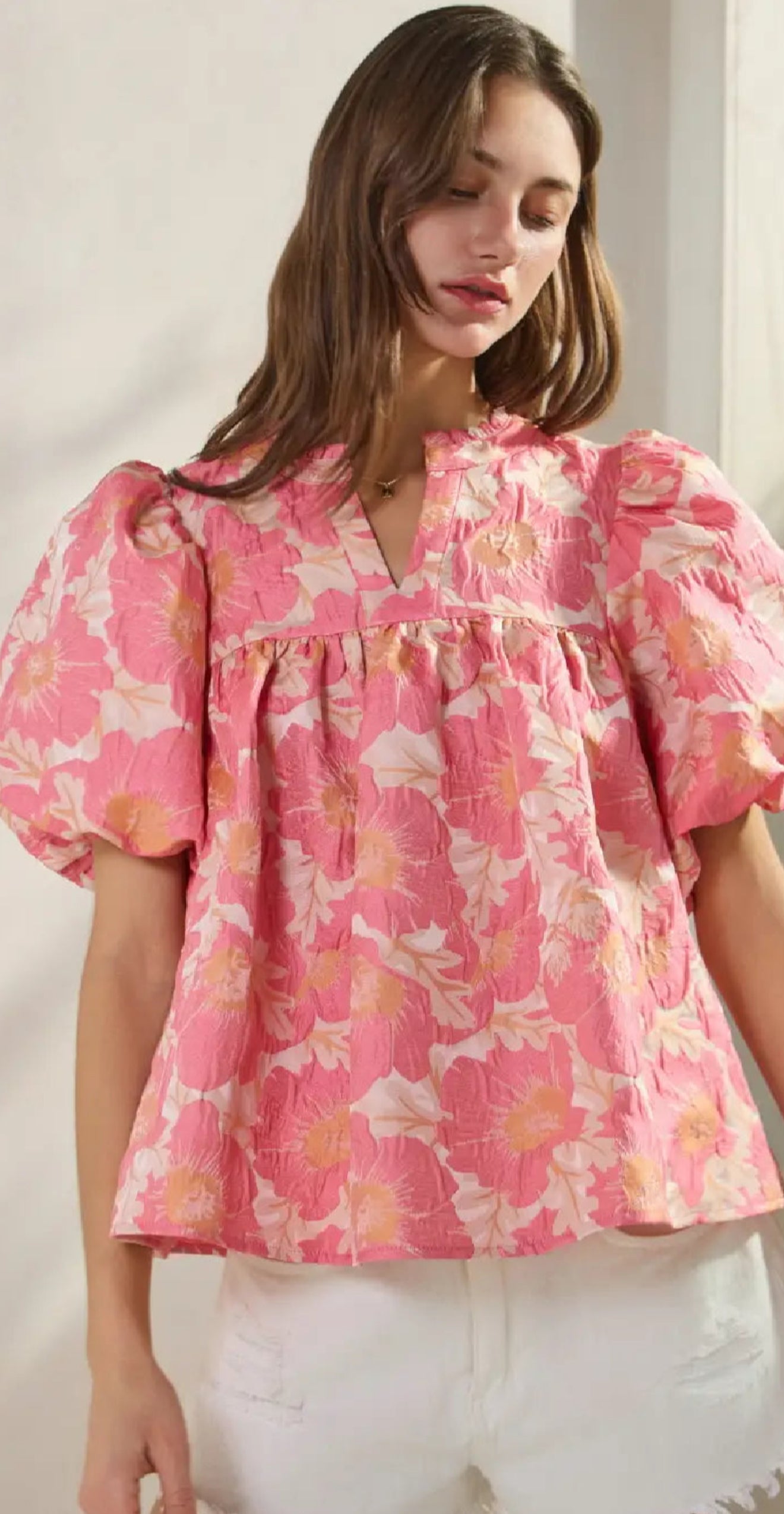 Floral satin weave jacquard babydoll top with bubble sleeve. Elastic at the end of the sleeve.