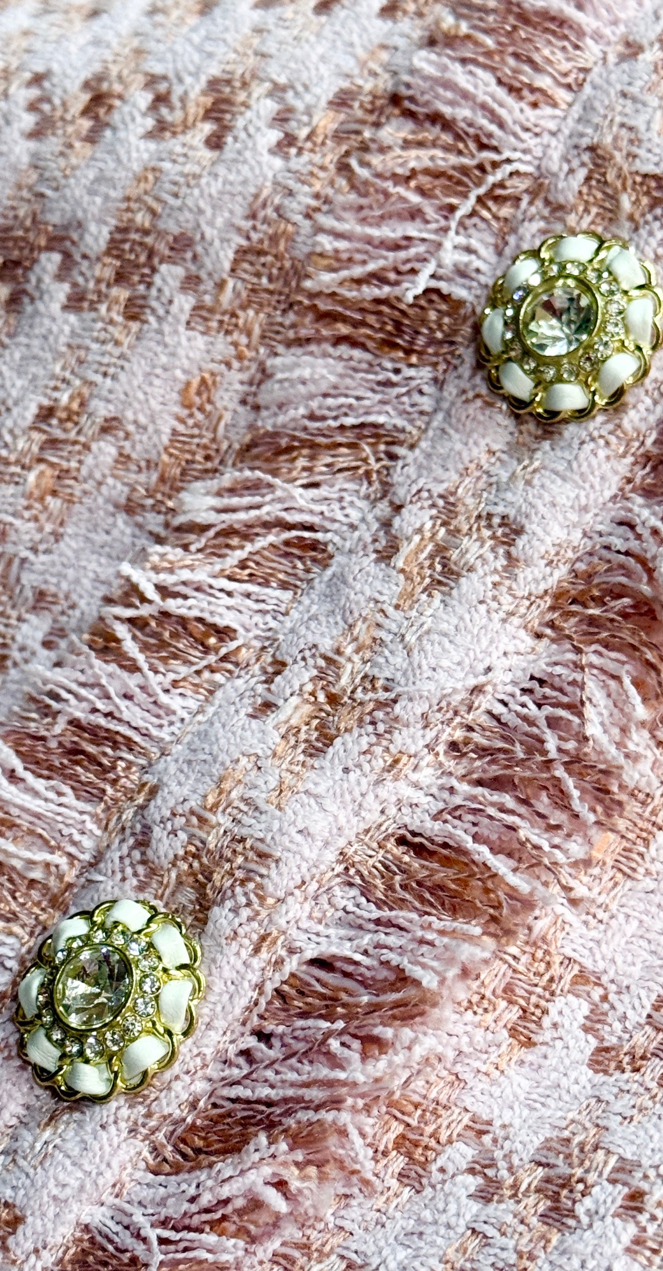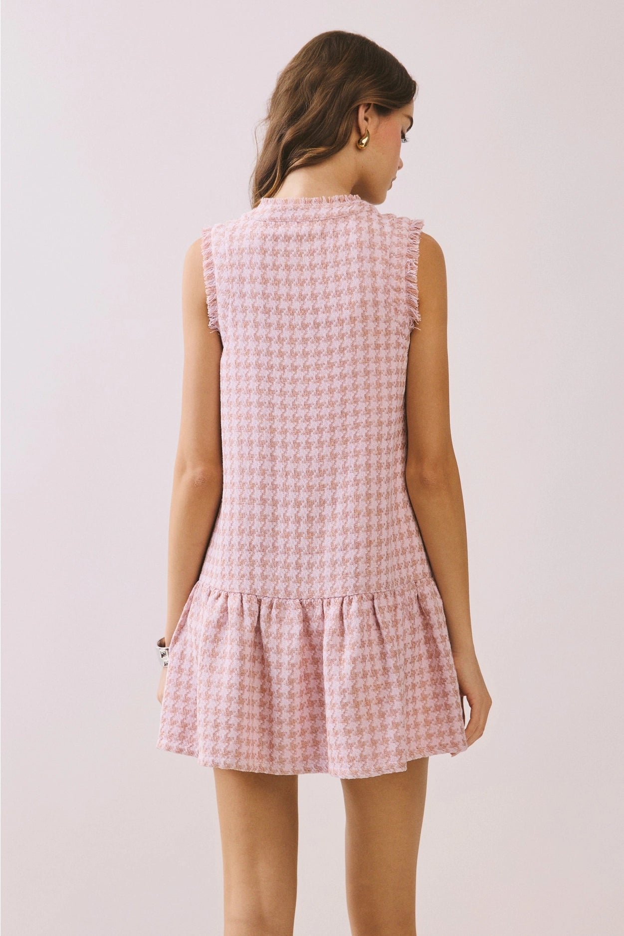 A sleeveless tweed mini dress featuring a textured houndstooth pattern and fringe trimming along the armholes and front placket. Designed with decorative front pockets and a dropped-waist. Finished with a front button-down closure and side pockets. Lined