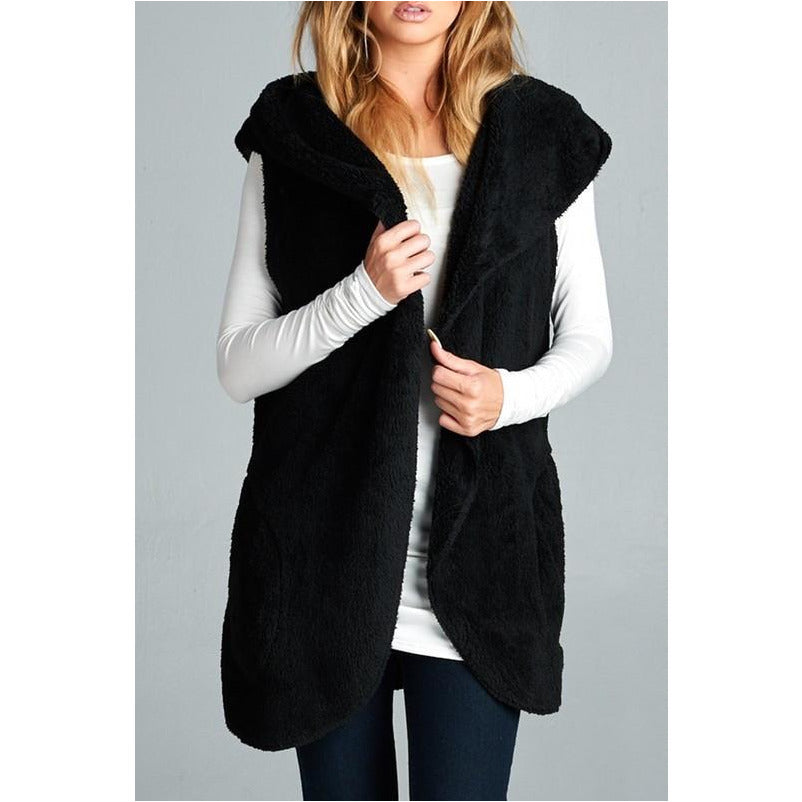 Ultra-soft, solid plush hooded vest with slit pockets on the side. This faux fur vest is lightweight and features a long body for comfort and easy wear.