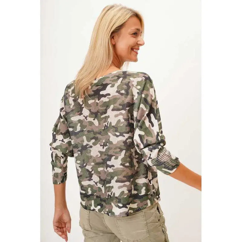 Camo Print Long Sleeve Top Highlights: 🧵 Fabric: Lightweight knit with subtle stretch 👕 Fit: Relaxed, easy-to-wear silhouette with drop shoulders 🎨 Design: Classic camouflage print in earthy green, beige, and black tones 👗 Style: Round neckline, long sleeves with...