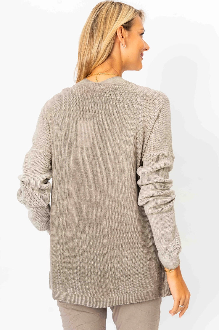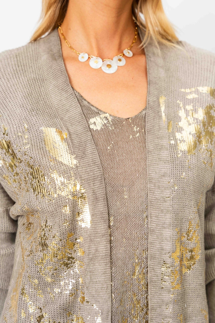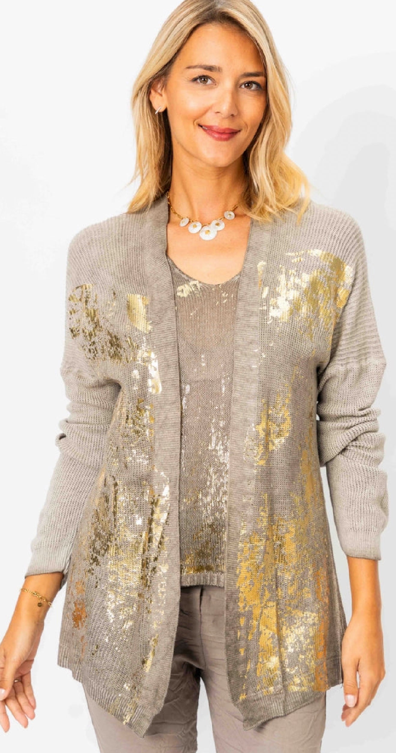 Gold foil sweater. Boat neckline, long sleeves, longer on back. Cold wash, so look like washed color. Colors: Grey or Taupe SM fits up to size 10/12 and LXL fits up to size 14/16 Modal/Viscose thin and smoth and not...