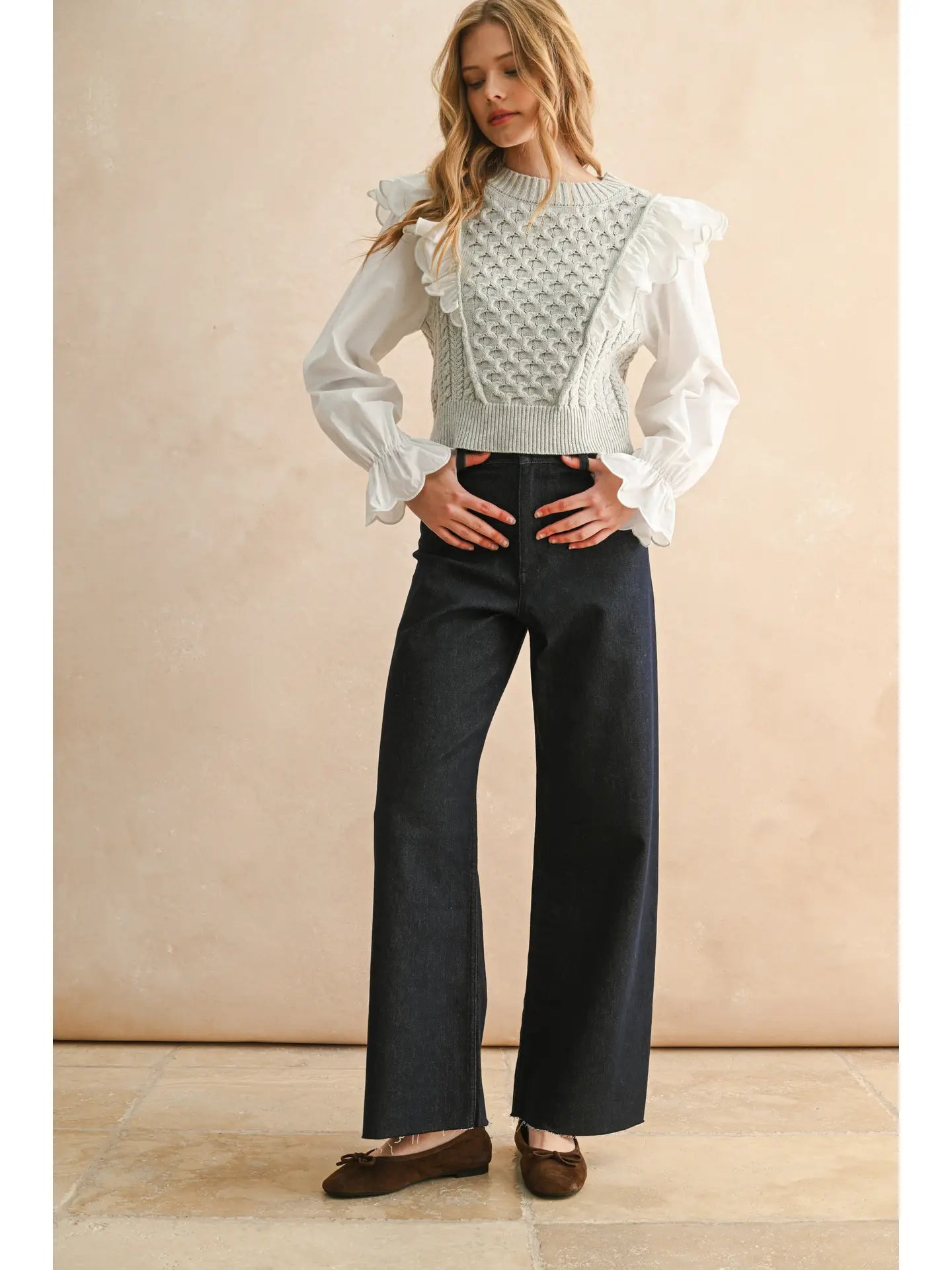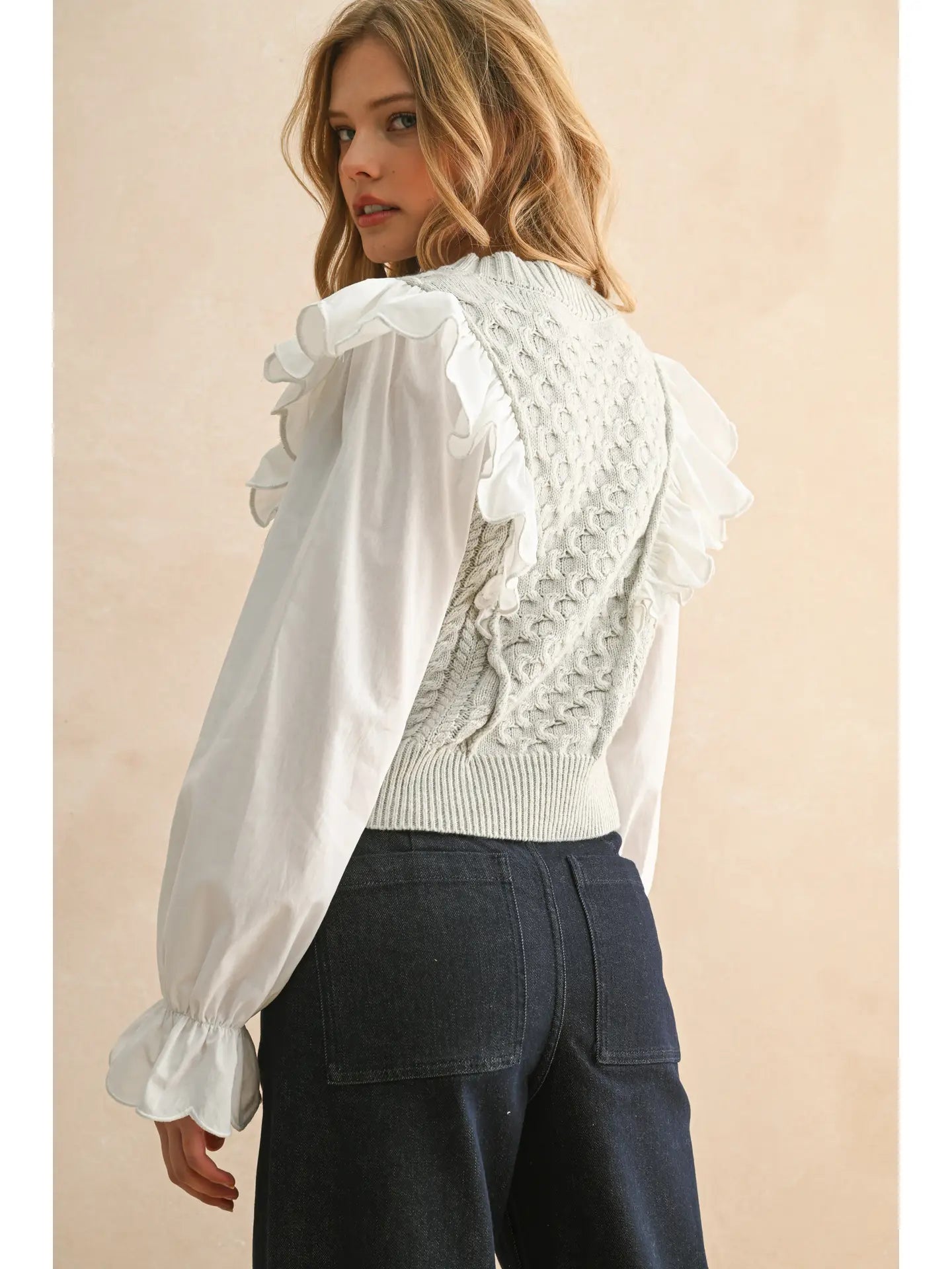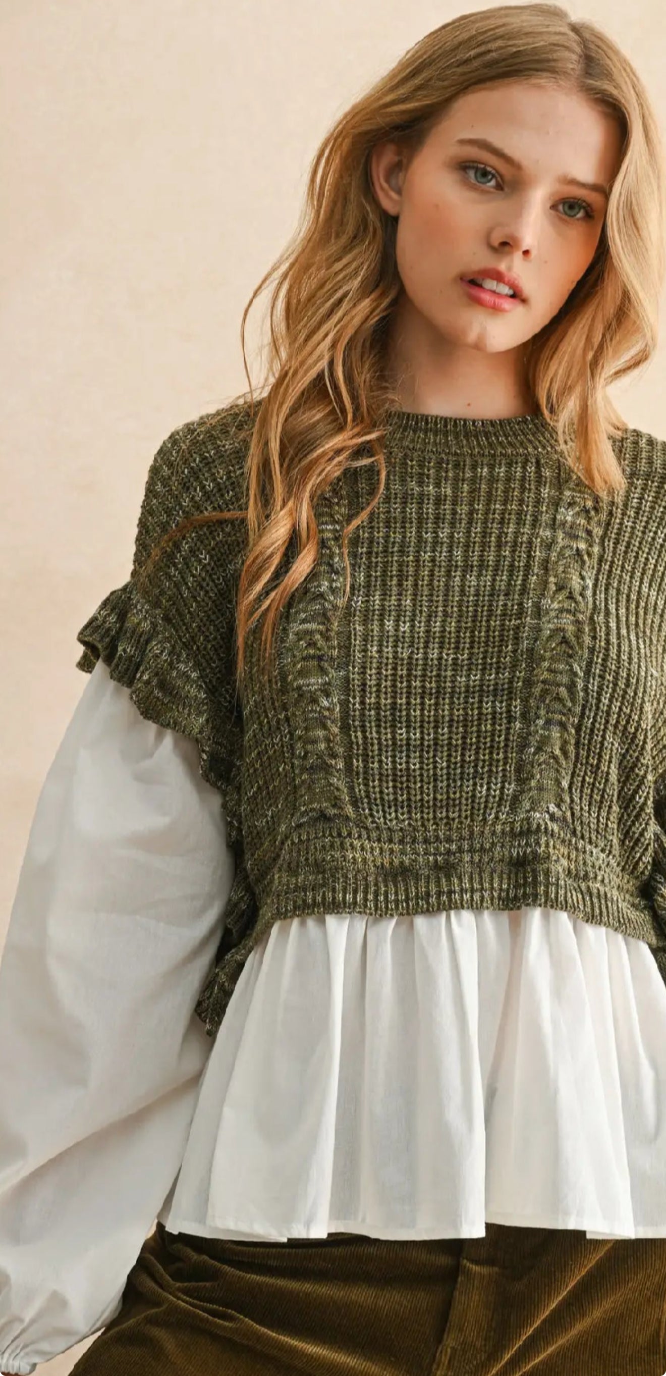 RUFFLE TRIMMED LONG SLEEVE SWEATER COMBO BLOUSE - part sweater part top