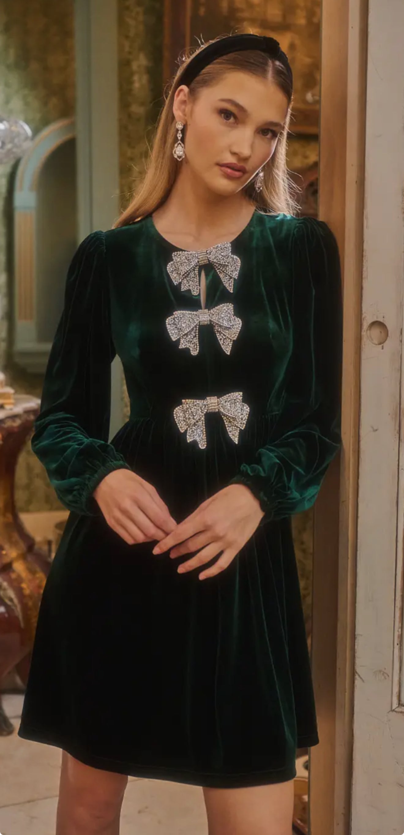 Celebrate any fabulous festivity with a dynamite look like the Glow Bow Velvet Mini Dress! This party-ready dress is composed of stretchy velvet fabric that shapes long sleeves, a round neckline, and a princess-seamed bodice adorned with cute bow-inspired details...