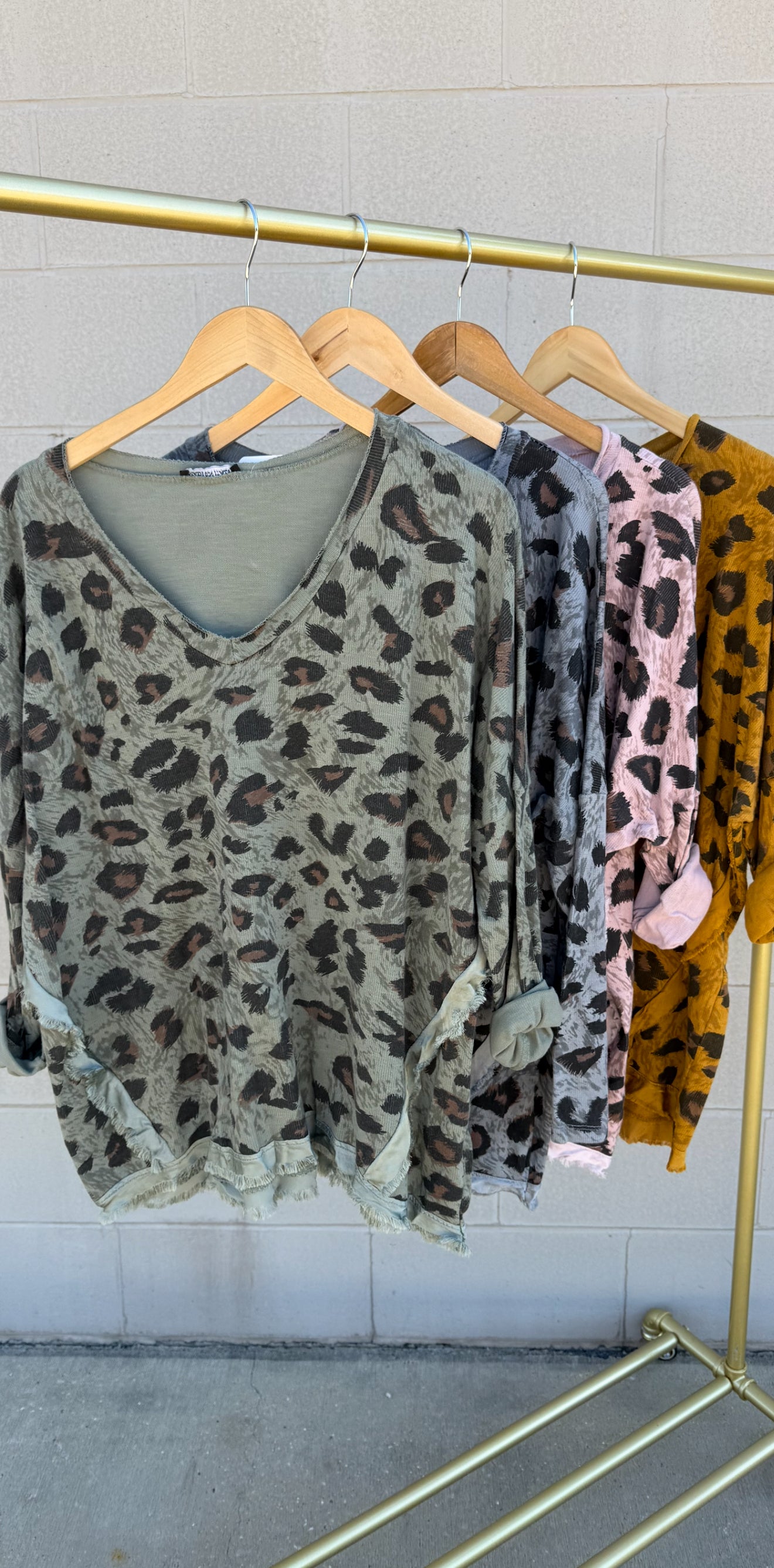 Cheetah Print Raw Edge Satin Trim Top. V-neck, long sleeve, raw edge on hem and asymmetrically on side seams, print on front and back - thin and perfect for any season Colors: Grey, Mustard, Olive Green or Pink One Size...