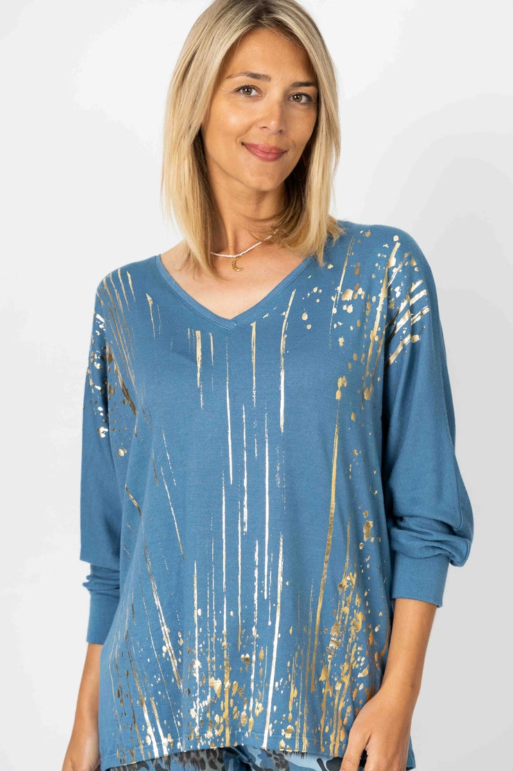 Gold Splatter Print Sweater. Long Sleeve w/ band cuff, v-neckline, gold foil on front, solid on back.