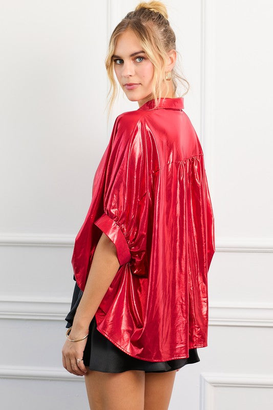 Get ready to dazzle at your next holiday party with our Holidaze Metallic Button Down Top! Featuring a solid metallic collar and a convenient button down design, this shirt is perfect for adding some festive flair to any outfit. Available...