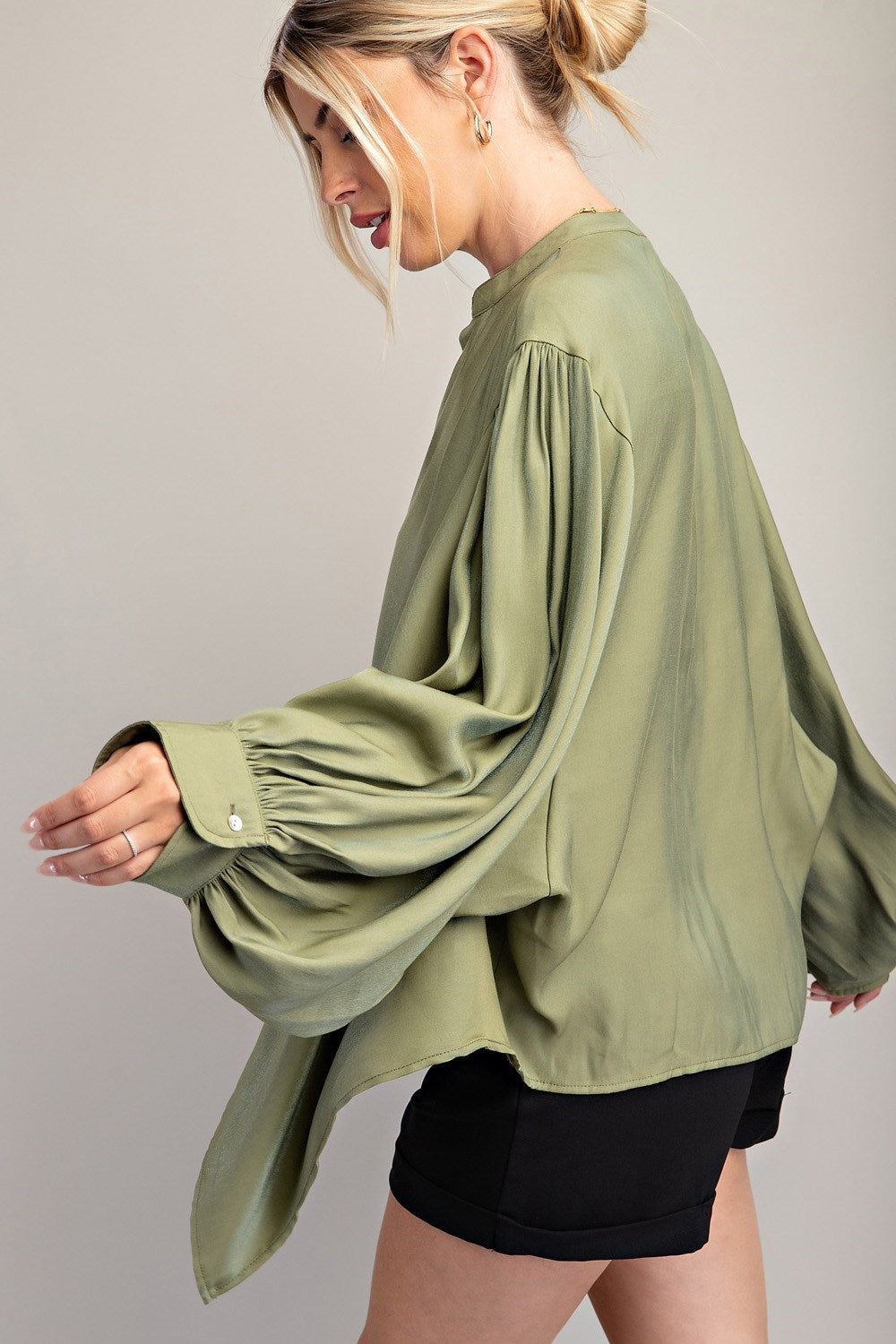 V-Neck Band Asymmetrical Hem Lurex Shirt - long sleeves and flowy cut - blousy puff sleevesModel Height: 5'9" Wearing Size Small Fabric: 90% Rayon 10% Spandex Colors: Black, Rust, Olive Green, or Taupe Sizing: Fits up to Small (6-8) Medium(10-12) ...