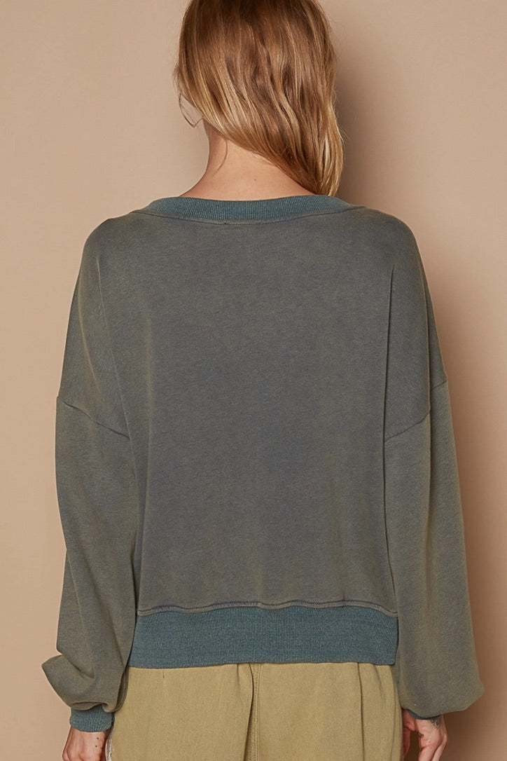 Designed in V-neck long sleeve, roomy fit in french terry with cut out detailing, contrast rib band point, vintage washed (can be worn 2 ways - front to back or back to front). Specs/Dimensions: - LENGTH: 13-1/4" - BUST: 23-1/2"...