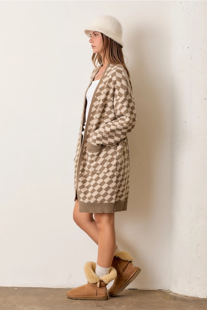 Upgrade your wardrobe with the Tiger Bomb Cardigan. Featuring a bold geo pattern and a fierce tiger motif on the back, this cardigan is sure to make a statement. The front pockets offer convenience while the open front and long...
