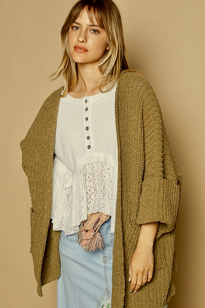 Edge-to-edge long sleeve with pockets roomy fit plush cardigan sweater.