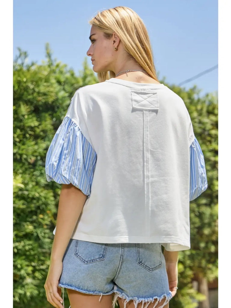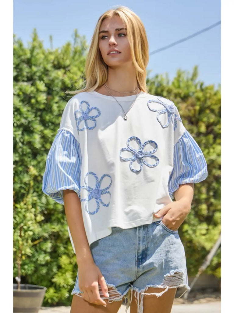Upgrade your wardrobe with our Southern Hospitality Top. Made with soft french terry, this top features delicate flower embroidery and stylish stripe bubble sleeves. Perfect for a casual yet chic look. Color: Blue/White Size: Small(4-6) Medium(8-10) Large(12-14) Fabric:65% Cotton, 35%...
