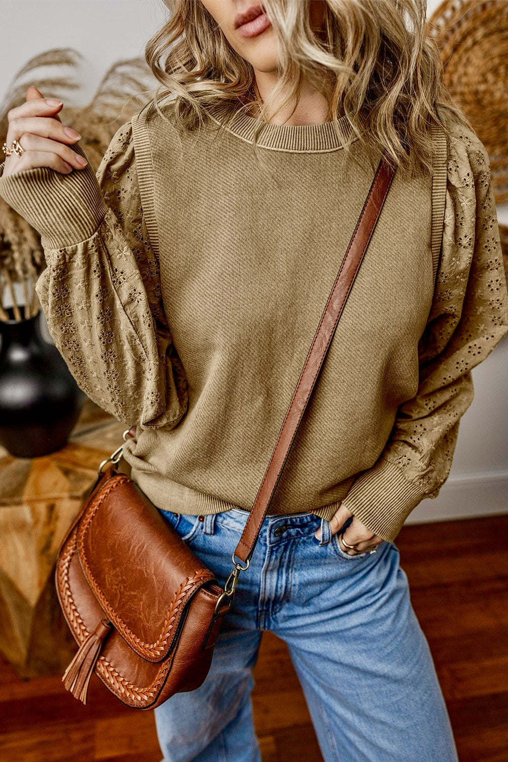 Elevate your casual style with this sweatshirt featuring intricate patchwork design and ribbed texture for a modern twist on a classic look. The eyelet embroidered sleeves add a touch of elegance to this cozy sweatshirt, making it a versatile piece...