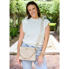 This quilted vegan leather crossbody is so fashion forward! It features a gorgeous neutral latte color that is oh so soft. It has a chunky gold chain accent that is removable, and it can be used as a carrying strap...