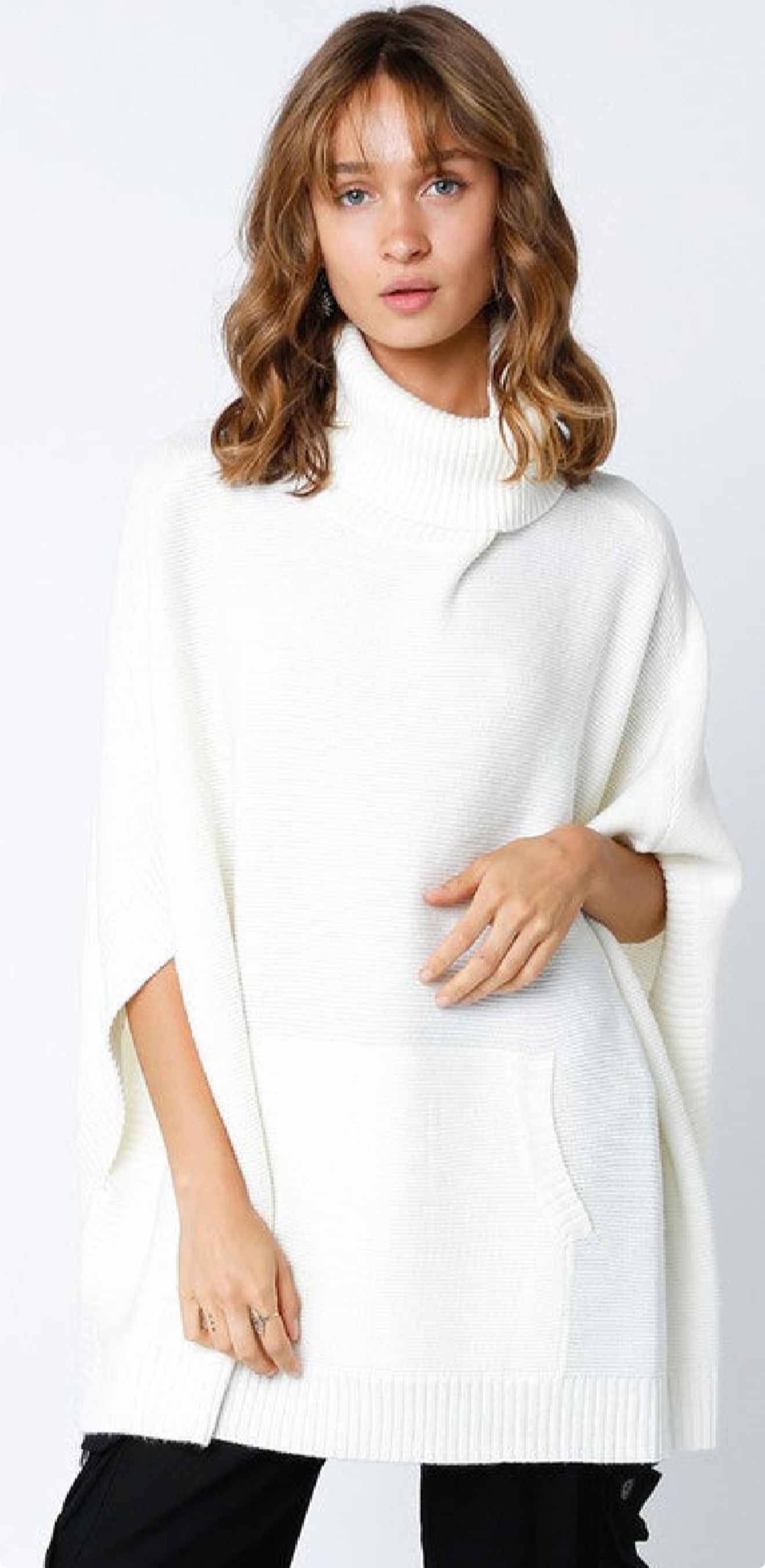 Our Emalee Sweater features a 1/2 sleeve, turtle neck, front kangaroo pocket, and an knit oversized fit.
