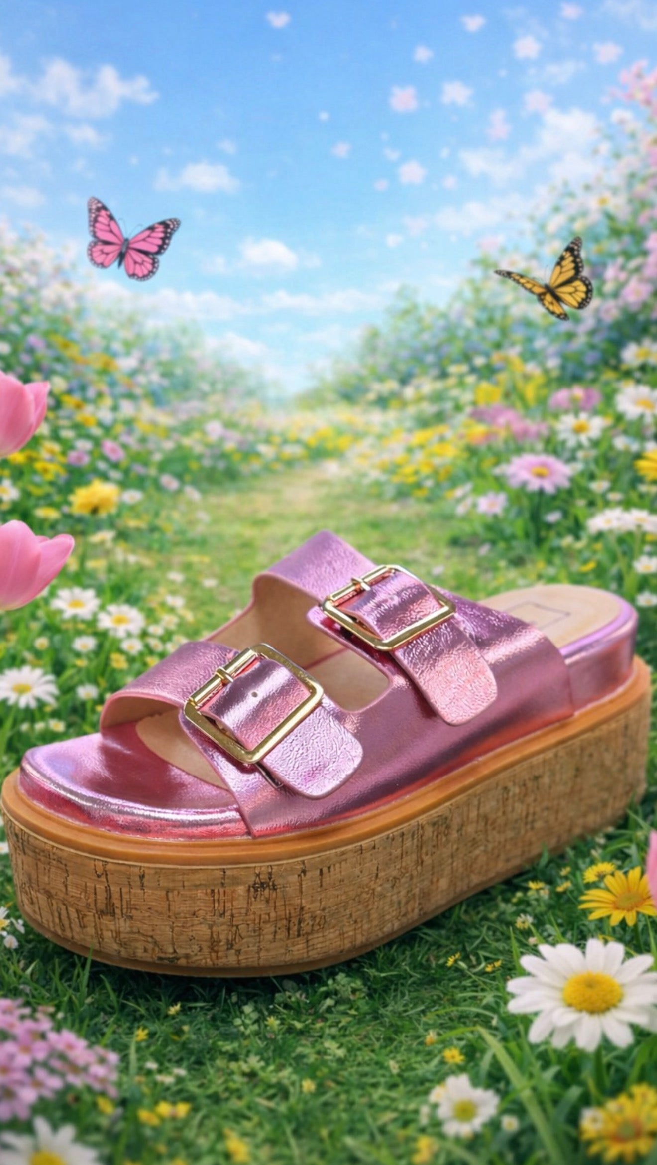 Our new addition, LUCINDA, features buckles that add a gleaming signature to the dual-strap upper of this dreamy metallic pink faux buttery leather slide sandal. It floats on a cushy memory foam footbed and a timeless cork-wrapped wedge platform. Wear yours with breezy summer dresses or slouchy jeans.
