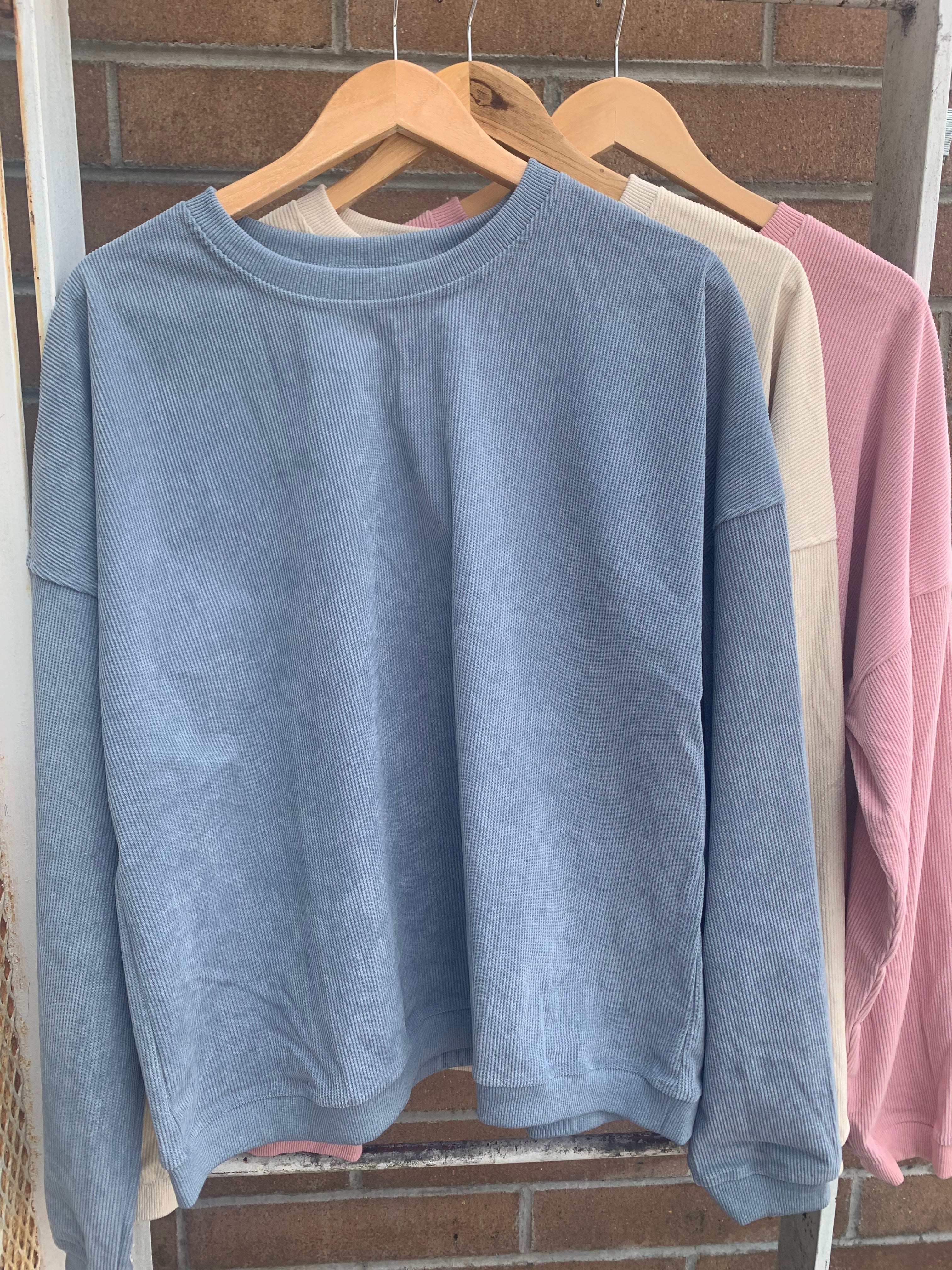 Banded at the neckline, cuff, and waist, these ribbed sweatshirts are perfect for mild Fall and Winter. Classic style that will match everything. Colors: Misty Blue. Ivory or Perfect Pink Fabric: 100% Polyester Sizing: Medium(6-8)  Large (10-12) XL (14-16)(We did...