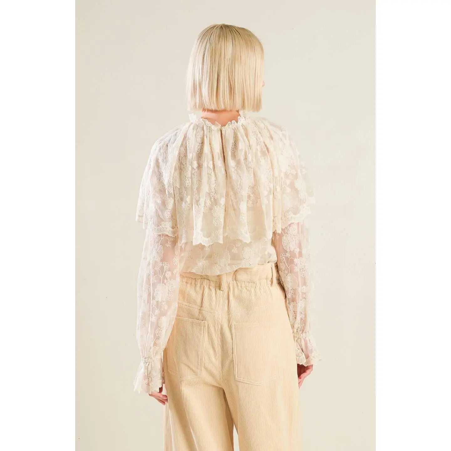 A woven lace top with laced edge neckline, long sleeve and back neck button closure Fabric: Self : 100% Nylon Lining : 100% Polyester Size & Fit - Model is 5`8" And Wearing Size Small - Measurements Taken From Size...