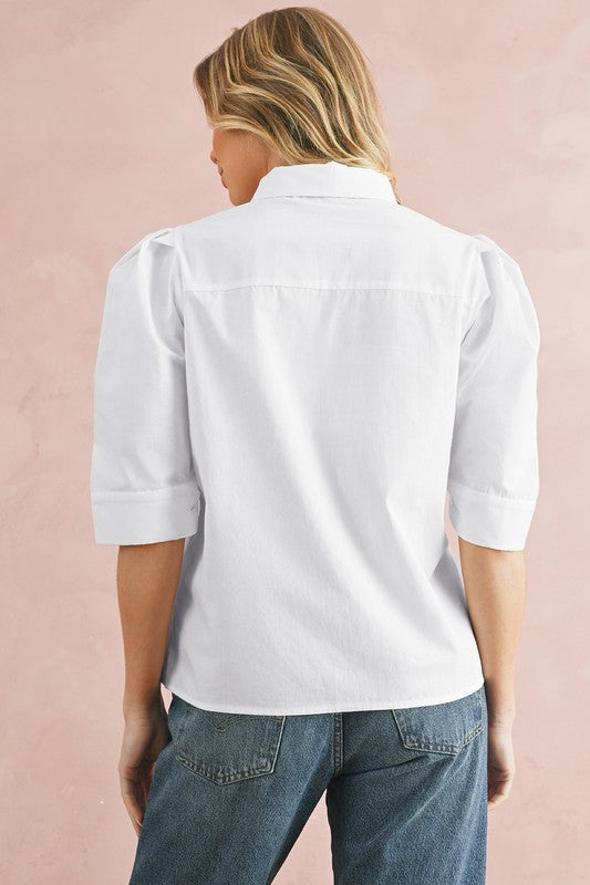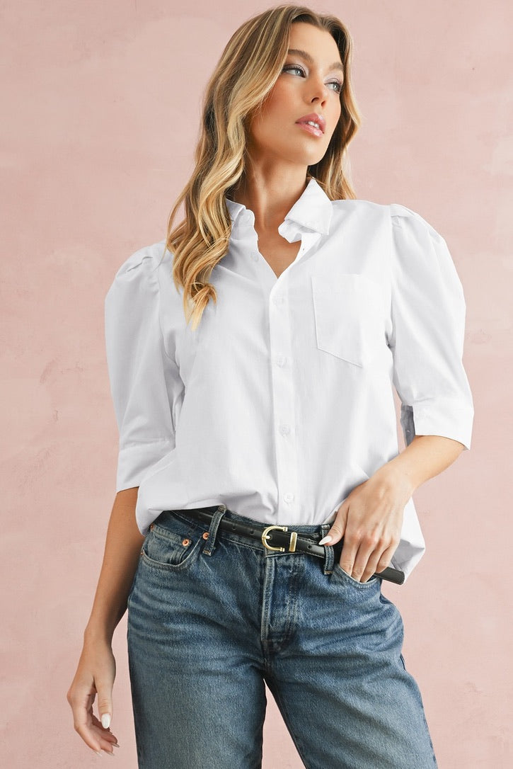 Introducing the Francis Top, a sleek and sophisticated solid color button up shirt. With elegant puff sleeves, this top offers a touch of luxury and exclusivity. Elevate your style game with this versatile piece that can be dressed up or...