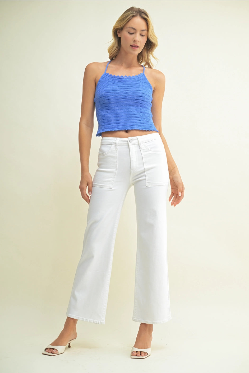 High rise elastic waistband wide leg jeans Comfort stretch denim, high rise waist, elastic waistband, utility pocket, cropped length, wide leg jeans F. Rise: 10 1/4" / inseam: 27" / leg opening: 21" Model is 5'10" wearing a size 26...