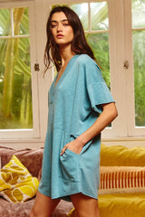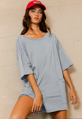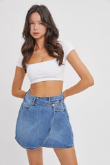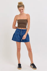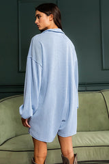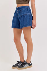 Two piece denim set with collared button down top - oversized and cropped to hit at waist and pull on elastic waist denim shorts with front patch pockets and drawstring Roomy and Boxy - this set is perfect for Gameday!...
