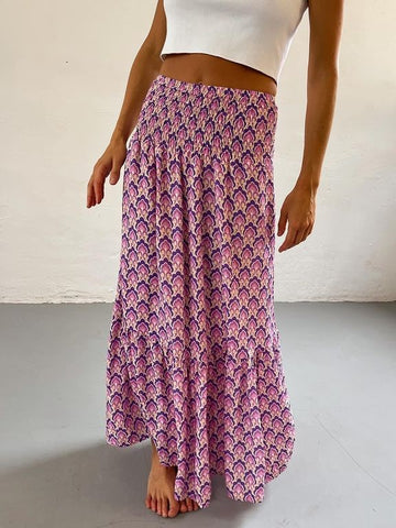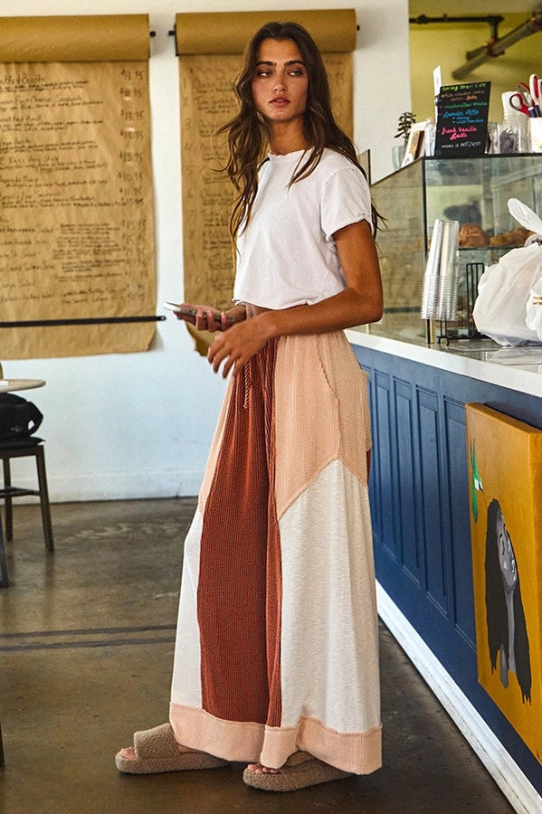Elastic waist with braided trim tie - soft jersey skirt with stretch and embroidered patches for a boho look. pocket details