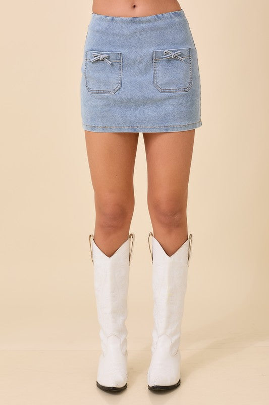 Mini Denim Skort With Front Pocket And Ribbon Bow Detail - Back Zipper