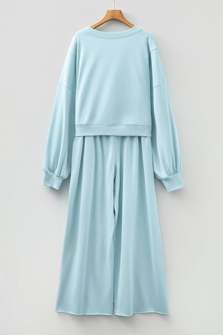 Drop Shoulder Puff Sleeve Long Sleeve Pullover and Wide Leg Pants Set - elastic waist pants with drawstring