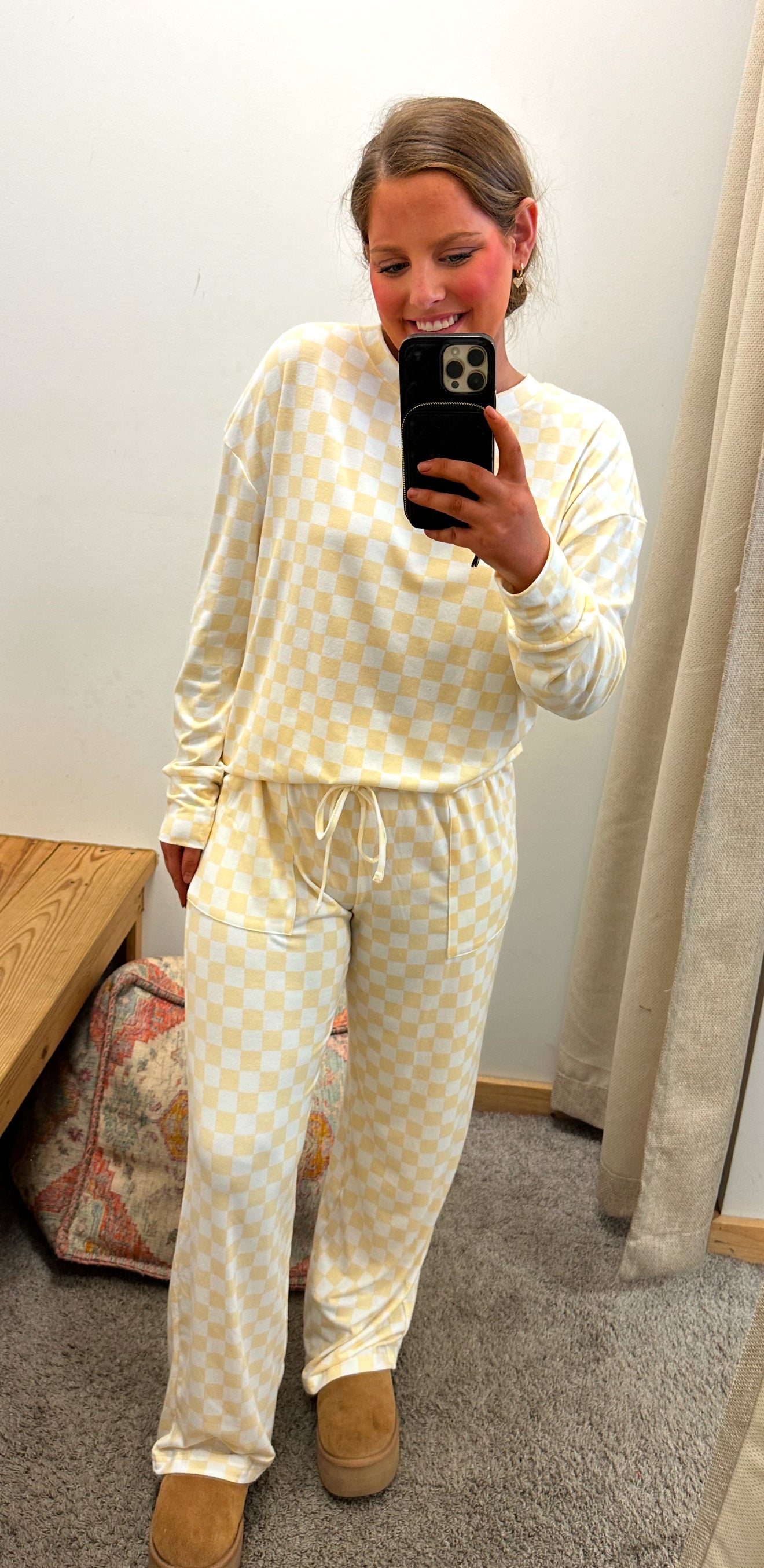Get cozy with our Vanilla Checkered Pants Set! This set includes a long sleeve top and pants, both featuring a stylish checkered print. Lounge in comfort while looking effortlessly chic. Perfect for a casual day out or a cozy night...