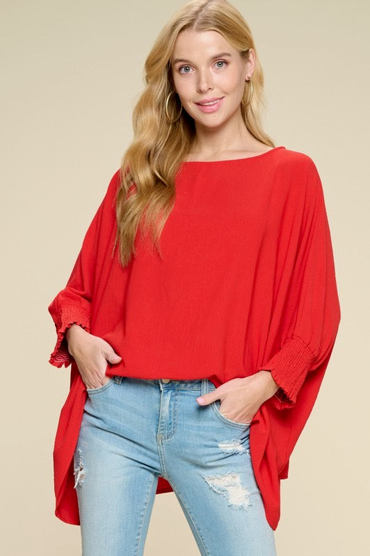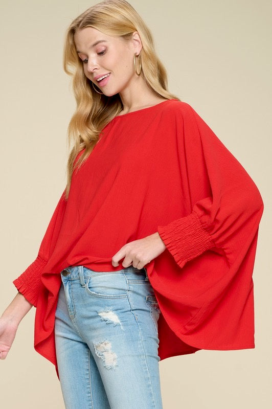 LUXE LONG SLEEVE V-NECK HI-LOW DOLPHIN HEM TOP - Regular and Plus SizesTOTAL BODY LENGTH: 28"(front), BUST: 36" approx.- MEASURED FROM SMALLFabric 95% RAYON 5% SPANDEXColor: True Red