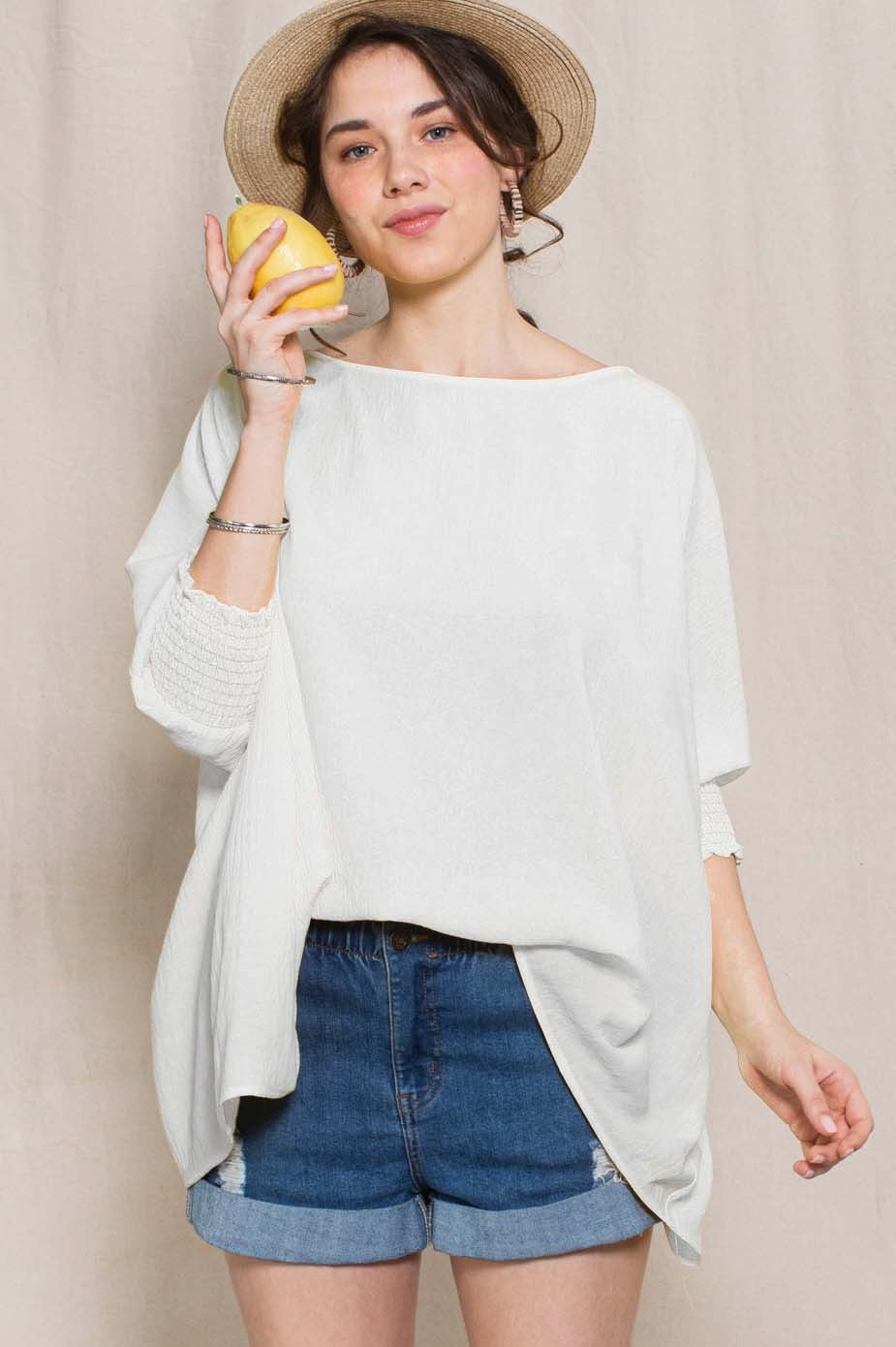 PLUS Size WOVEN PUFF SLEEVE BLOUSE WITH SMOCKED HEM AND CUFFS - Pearl button closure at the back of the neck at the TOTAL BODY LENGTH: 27.5", BUST: 49" approx. - MEASURED FROM 1X Color: Cream, Lt. Green, Lt. Rose...