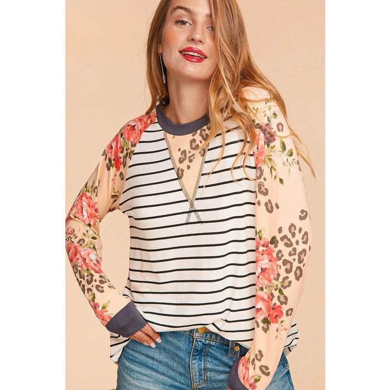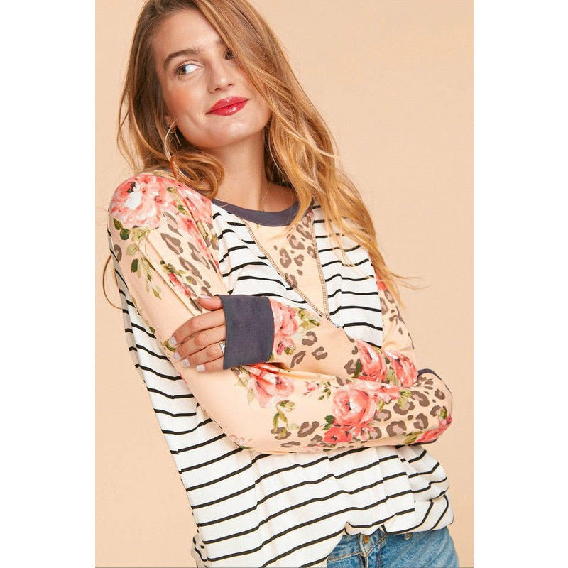 Color Blocked Patterned top with stripes and floral leopard animal print knit top.
