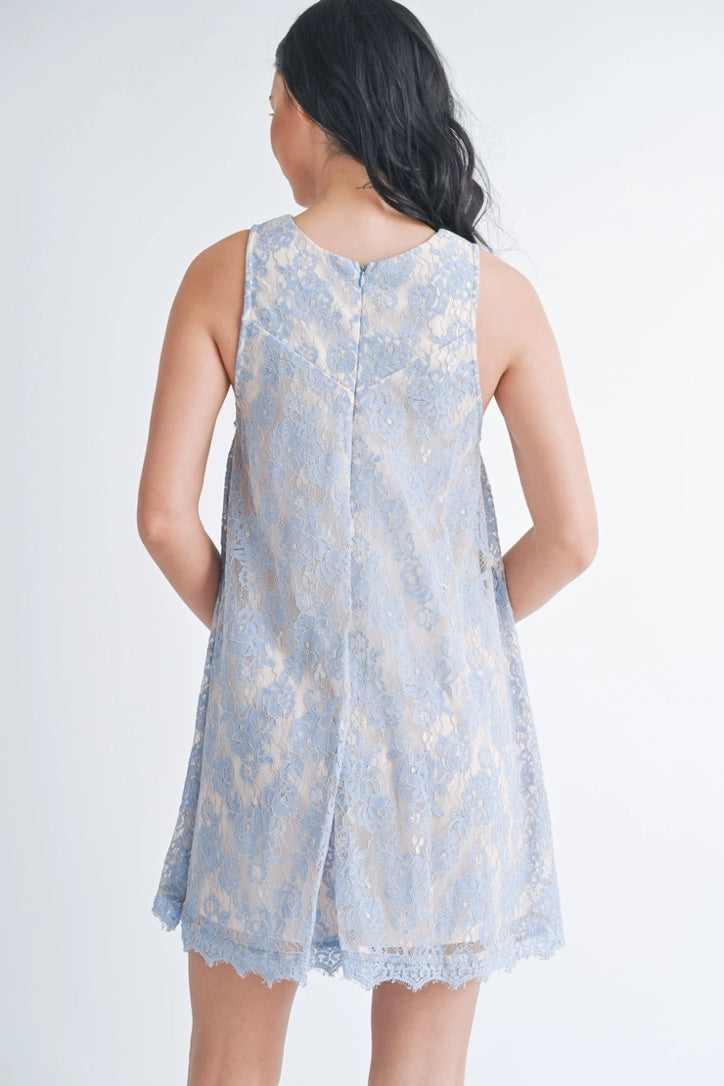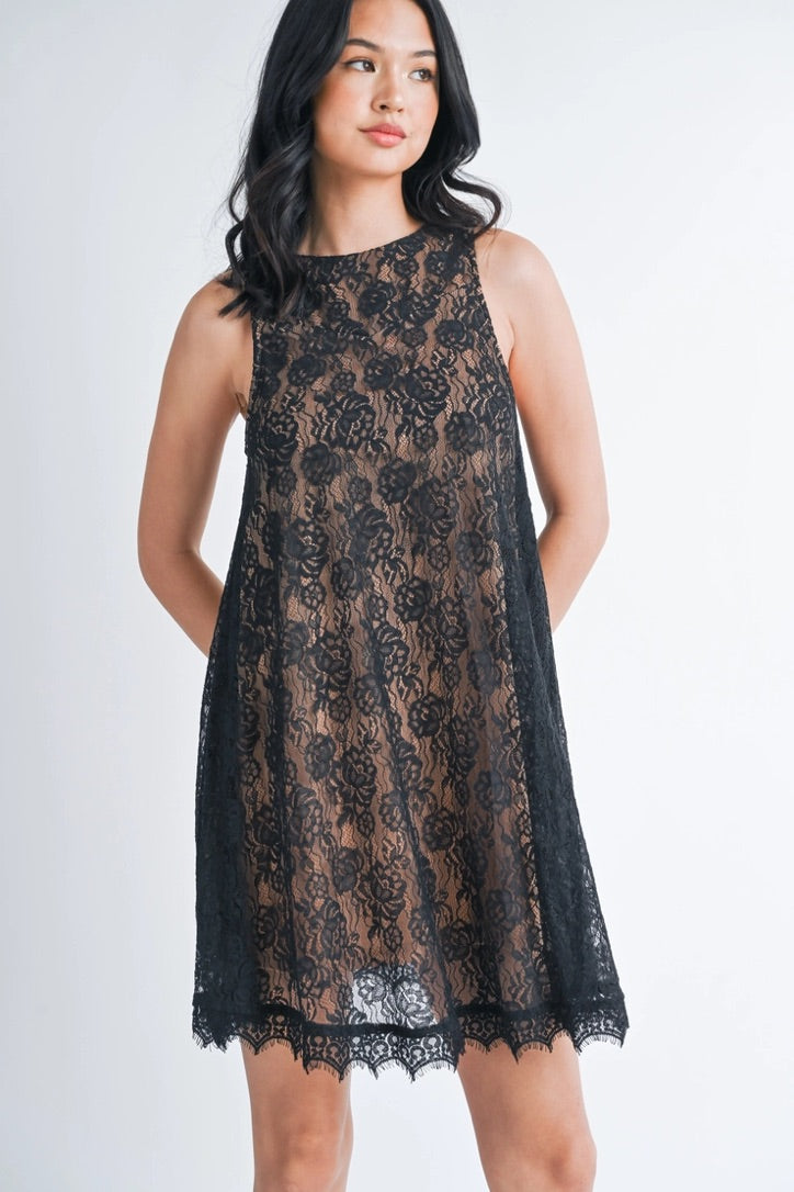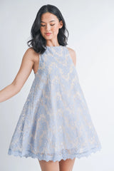 A woven lace mini dress featuring high neckline, long bell sleeve and back neck button closure  Fabric: 100% Polyester Lining : 100% Polyester Size & Fit - Model is 5`8" And Wearing Size Small - Measurements Taken From Size Small...