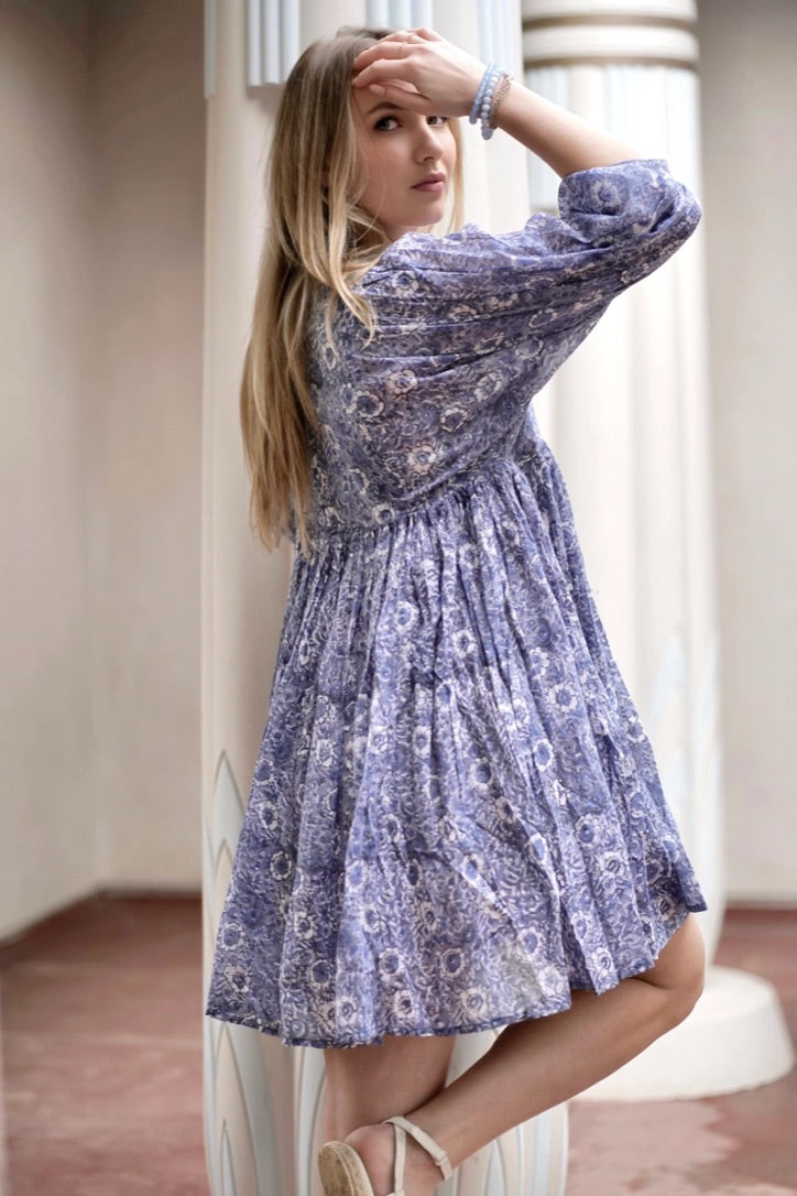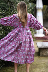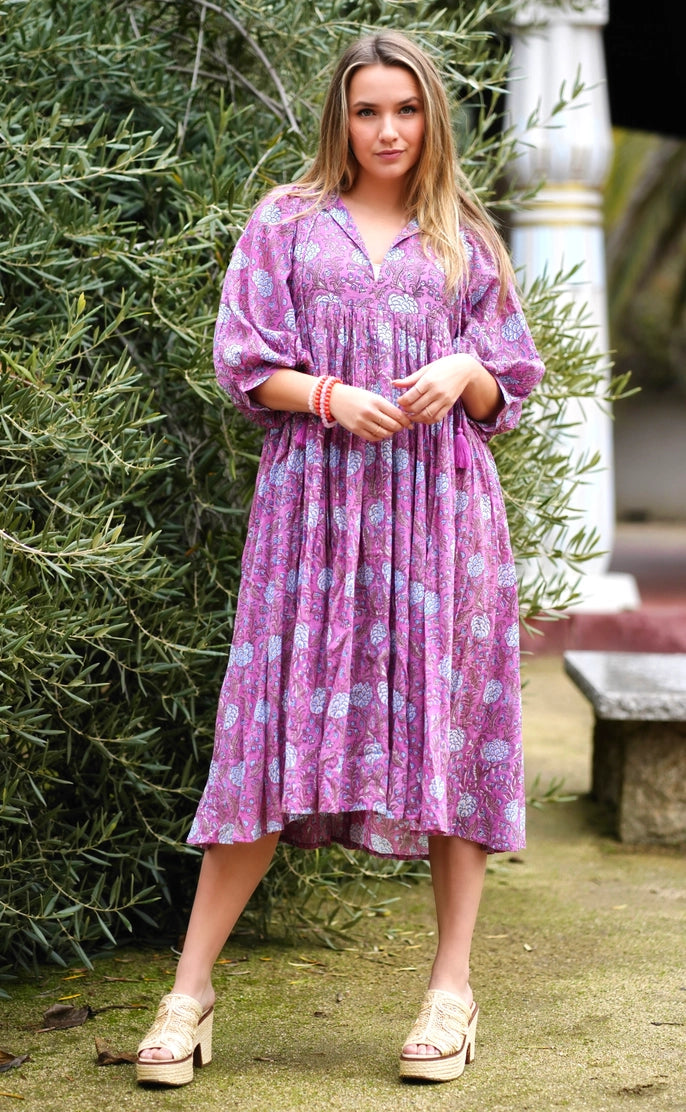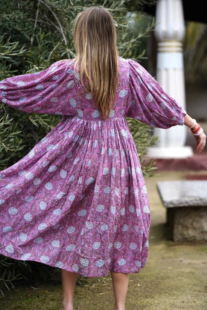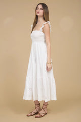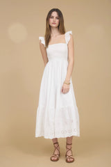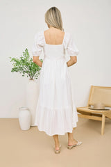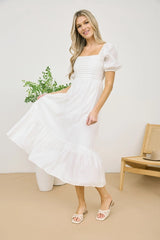 DARLING COTTON MAXI DRESS FEATURES: - COTTON MUSLIN FABRICATION - SQUARE NECKLINE WITH RUFFLED EDGES - 3/4 PUFF SLEEVES - BASQUE WAISTLINE WITH PRINCESS SEAMS ON BODICE - PARTIALLY SMOCKED BACK BODICE WITH DECORATIVE NON FUNCTIONAL WOODEN BUTTONS - SIDE...