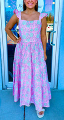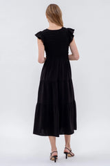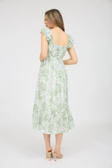 A printed woven midi dress featuring round neckline, long sleeve with ruffled shoulder, tiered skirt, smocked waist band and back neck button closure Fabric: 100% Polyester Size & Fit - Model is 5`8" And Wearing Size Small - Measurements Taken...