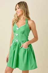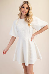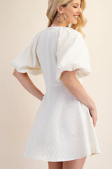 Playful and polished, this mini dress pairs charming puff sleeves with a round neckline crowned by a dazzling crystal bow. A fun twist on timeless style. Fabric: 95% Polyester, 5% Spandex Puff short sleeves A-line silhouette Round neckline Side pockets ...
