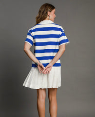 Polished fabric for a sophisticated sheen - Striped Trim Short Sleeve Shirt Dress . Measurements for Size S / Designed in USA - Button front and side pockets Body Length: 35 in - Bust Width: 42 1/2 in - Sleeve...