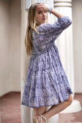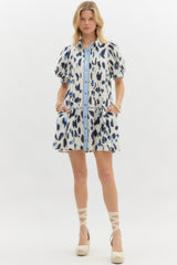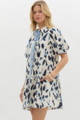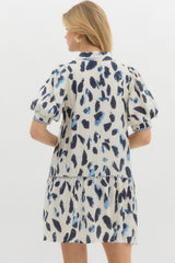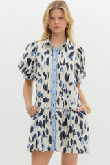 A mini dress featuring a bold leopard and abstract print. Designed with a gathered round neckline, voluminous puff sleeves, and a breezy silhouette. Finished with a back keyhole and button closure. Lined Model Size + Fit: Model height: 5'11" Dress...