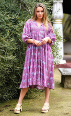 Flower Patch Boarder Print V-Neck Midi DressKey Features• Flower Patch / Boarder Print• Long sleeve tiered maxi dress• Split neckline with ruffled stand collar• Ruffled hem and sleeve cuffs• Elastic waist• Skirt LinedFit & Model Notes• Model is 5'9" and...