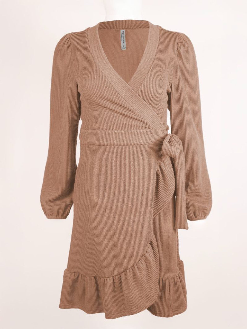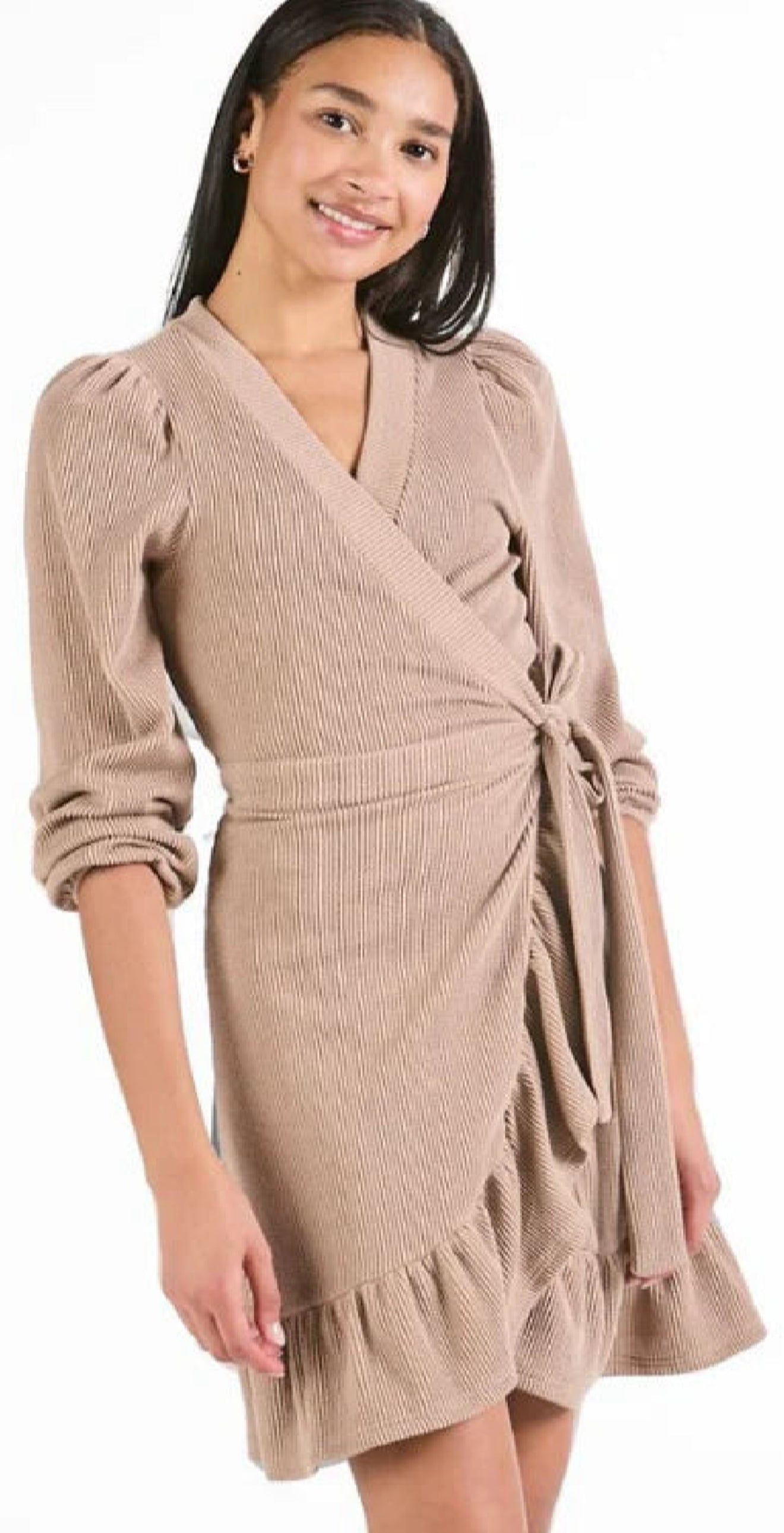 Step out in style with this cute knit wrap dress featuring wrap waist construction, flounce hem, and balloon sleeve. Length: 38" XL Color: Umber - Chocolate Milk - Light Brown Sizing: XS (0-2) Small(2-4) Medium (6-8) Large (10-12 )XL(14) XXL...