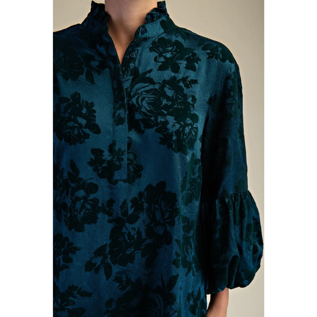 Roomy Cut Multicolor floral print Split neckline with smocked yoke detail Long puff sleeves with elastic cuffs Piping details Lined Fit Model Notes Model is 5'10 and is wearing a small Length: 30" Shoulder Seam to Hem (Large) Fabric: 83%...