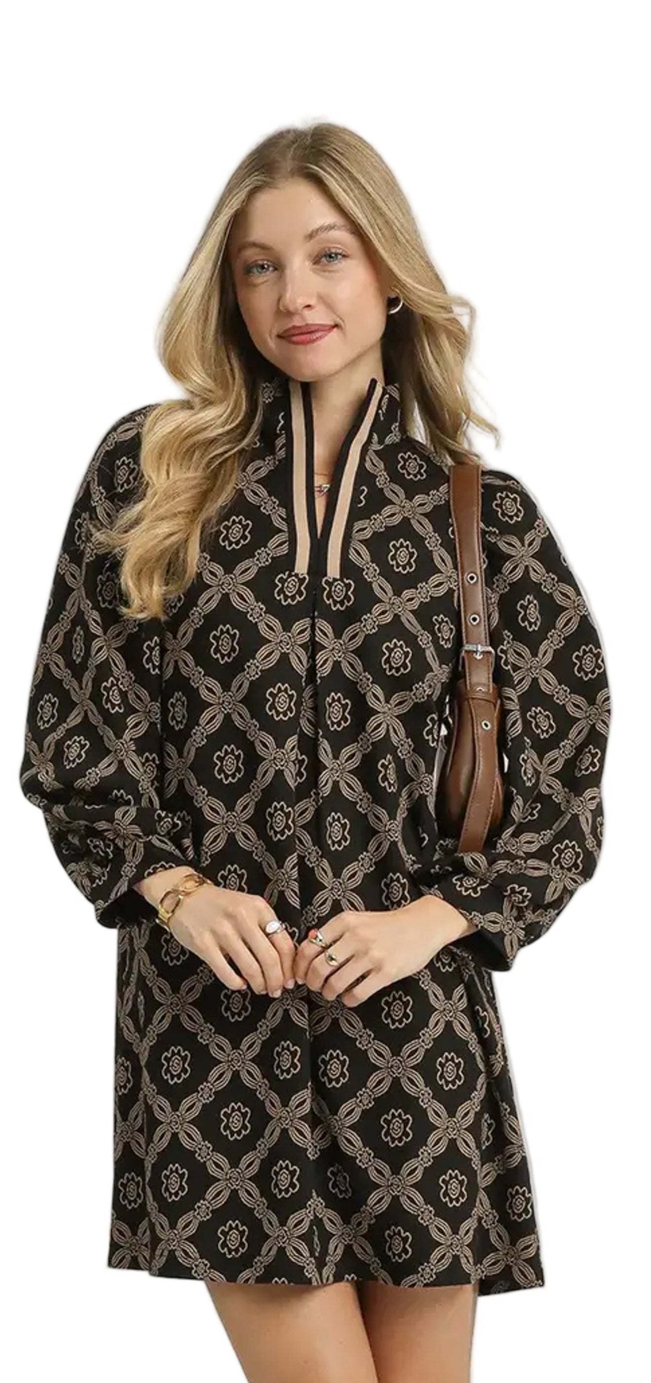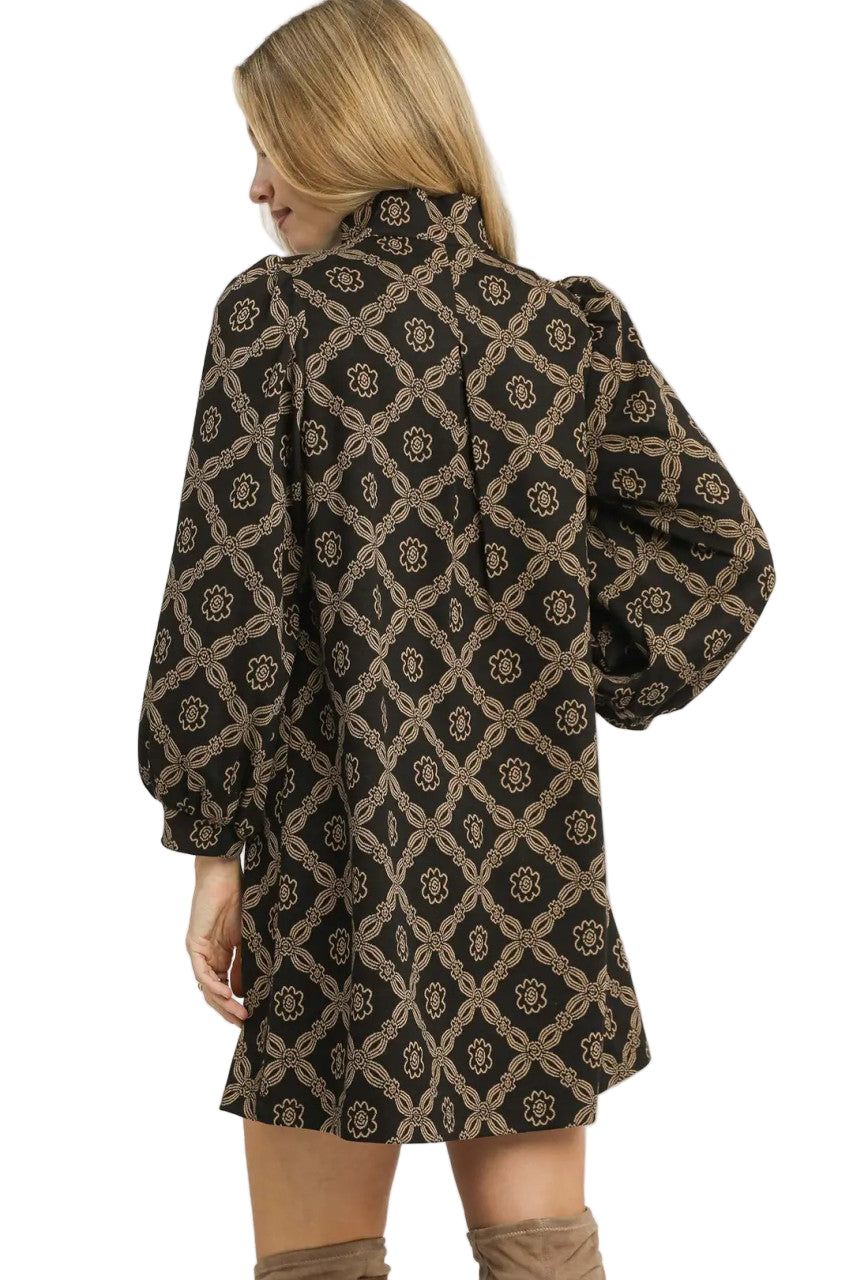 Black Geometric Print Long Sleeve Mini Dress • Split neckline with striped trim detail• Long puff sleeves with button cuffs• Relaxed Cut Split neckline with striped trim detail• Long puff sleeves with button cuffs• Relaxed, flowy silhouette• Mini dress• Not...