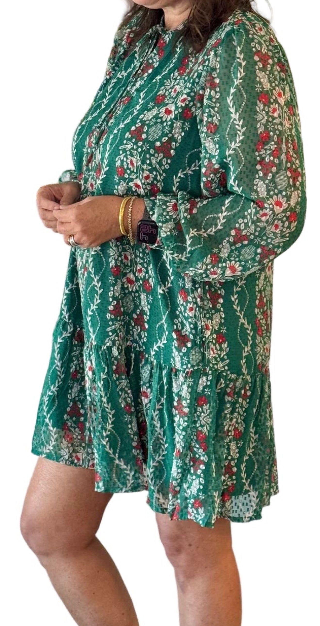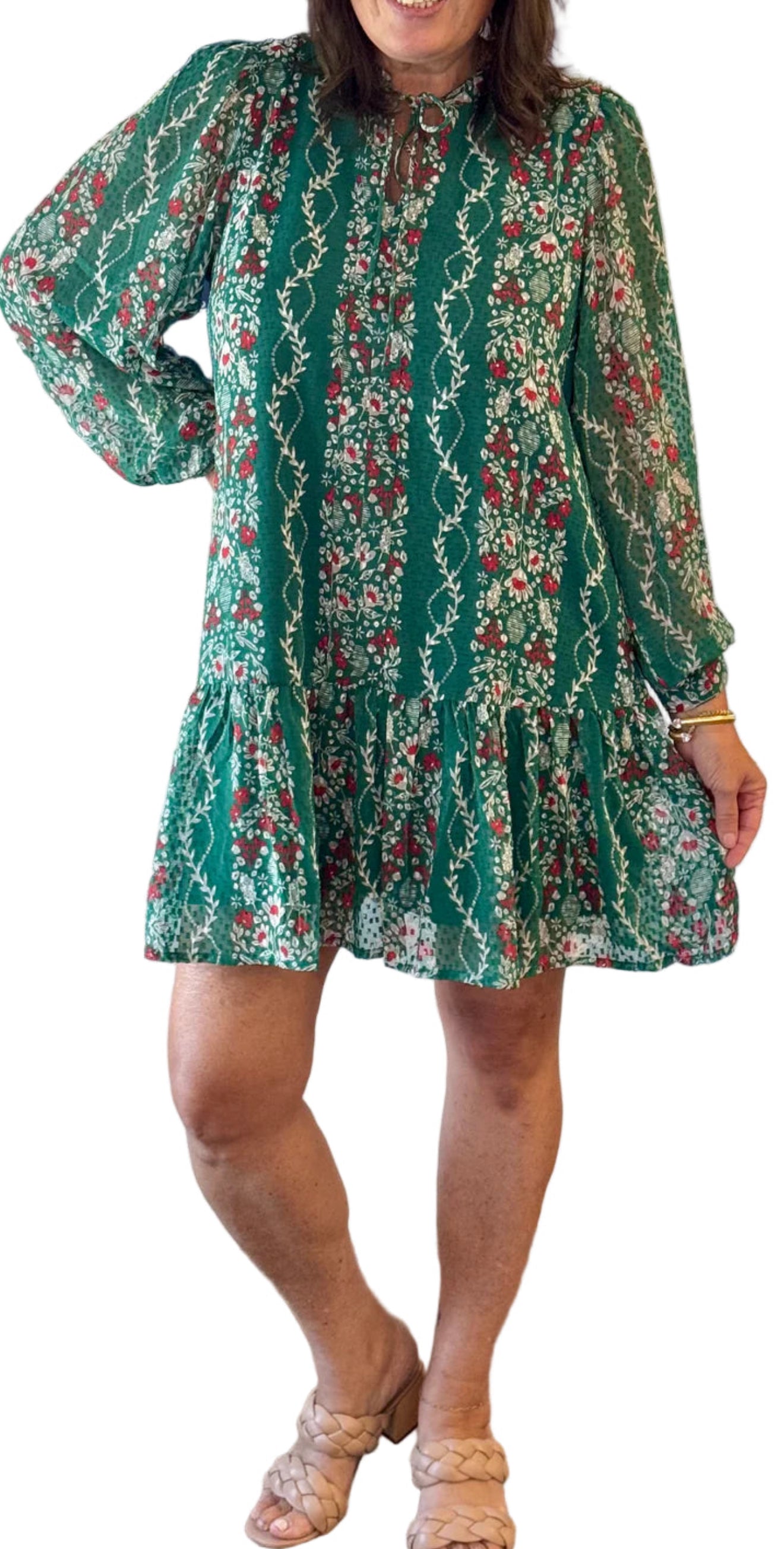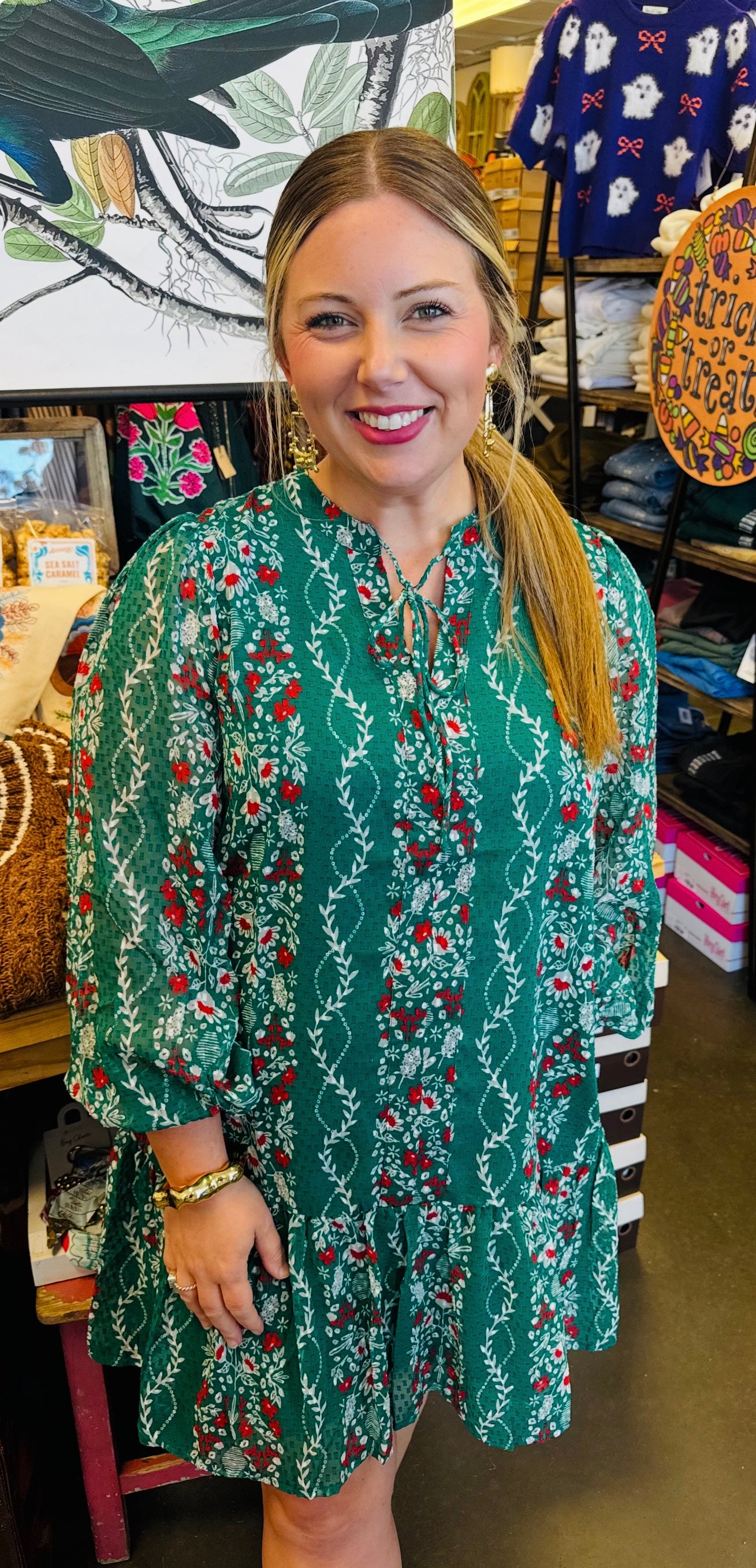 Poet neckline, long sleeves, sheer overlay and lined through the body, this drop waist dress with ties at the neckline is perfect for Christmas with it's all over red and green floral print. Color: Green Fabric: 100% Polyester Length: 37"...