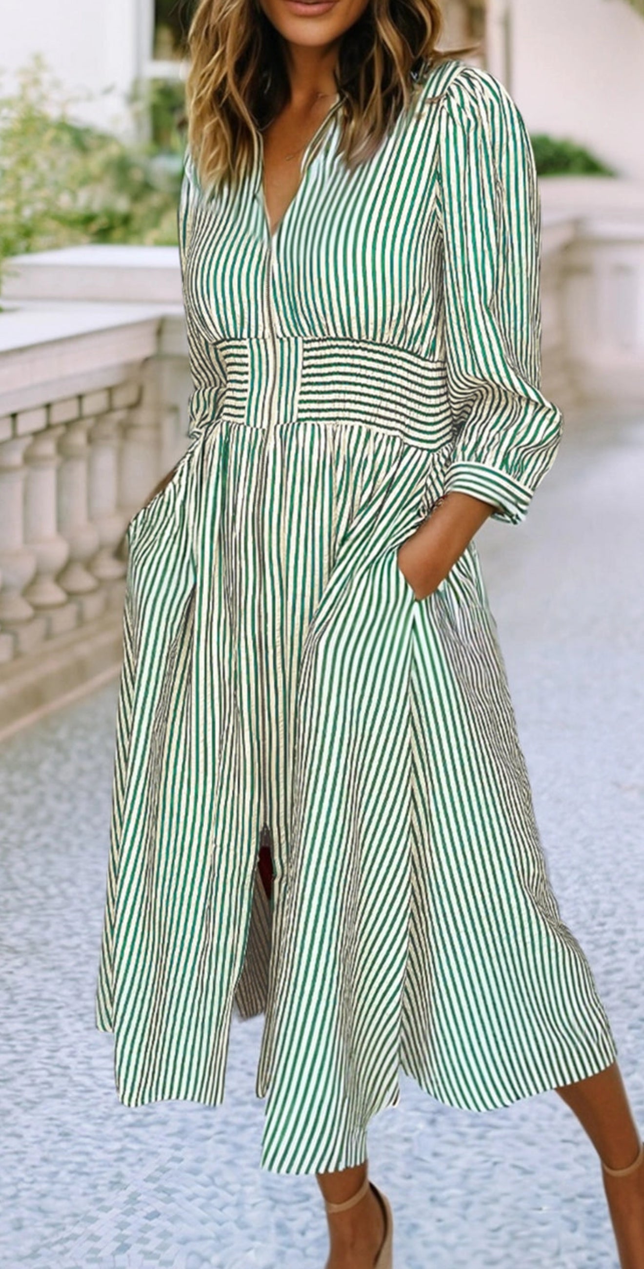 Cinched Waist striped dress with three quarter sleeves ✨ Effortlessly chic with a flattering V-neck. 🔗 Zip front closure for easy wear. 👗 Cinched high waist shapes your figure. Side pockets Color: Green Length: 49" Sizing: Small(2-4) Medium(6-8) Large(10-12) XL...
