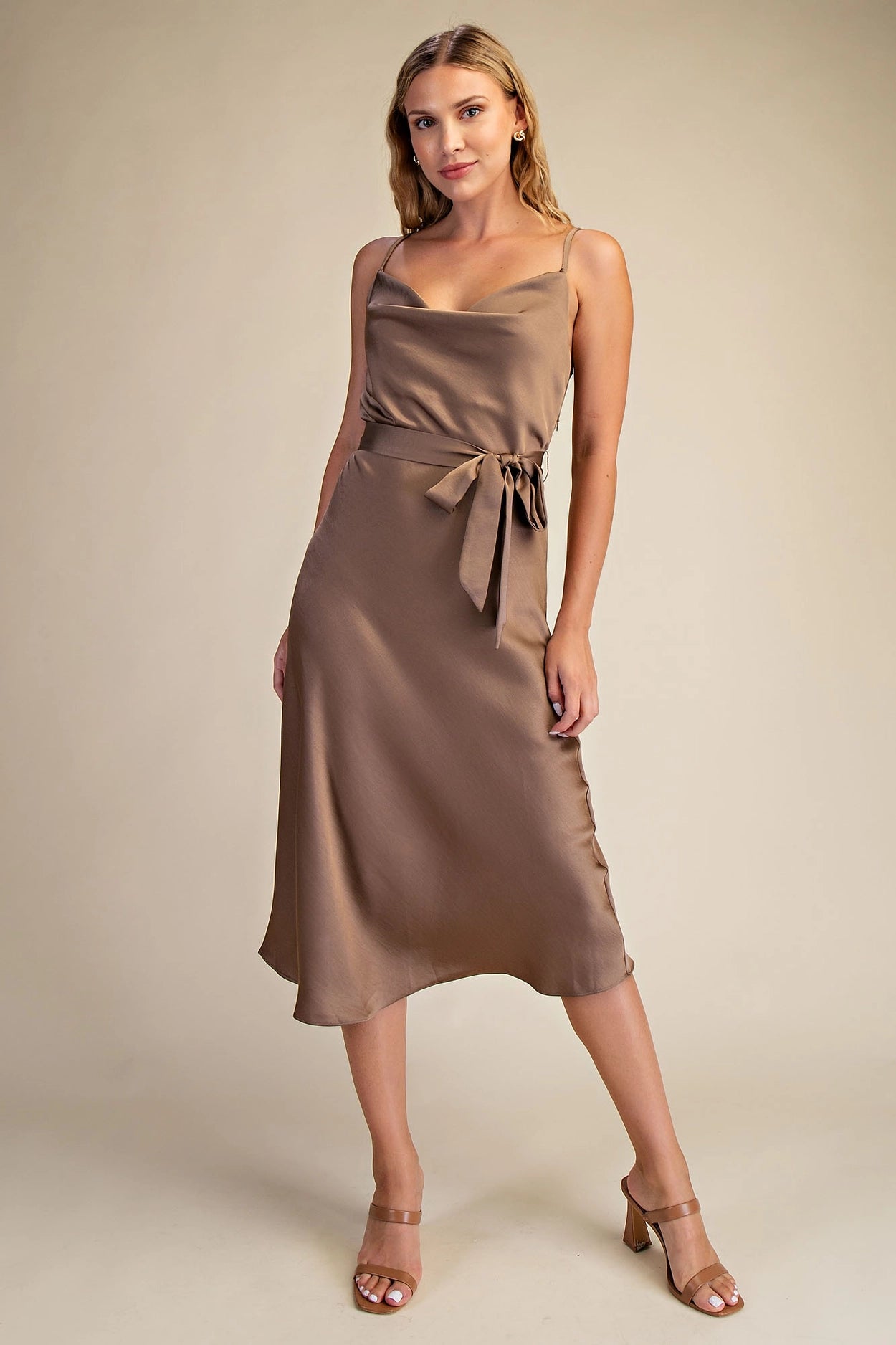 Draped Neck Sleeveless Midi Dress tie at the waist