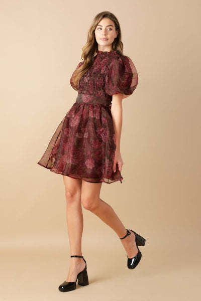 A printed woven organza mini dress featuring ruffled high neckline, long sleeve with smocked cuff, smocked bodice, ruffled hemline and back neck button closure Details: Self : 100% Polyester Lining : 100% Polyester Size & Fit - Model is 5`8" And Wearing Size Small - Measurements Taken From Size Small - Approx. Length: 37"