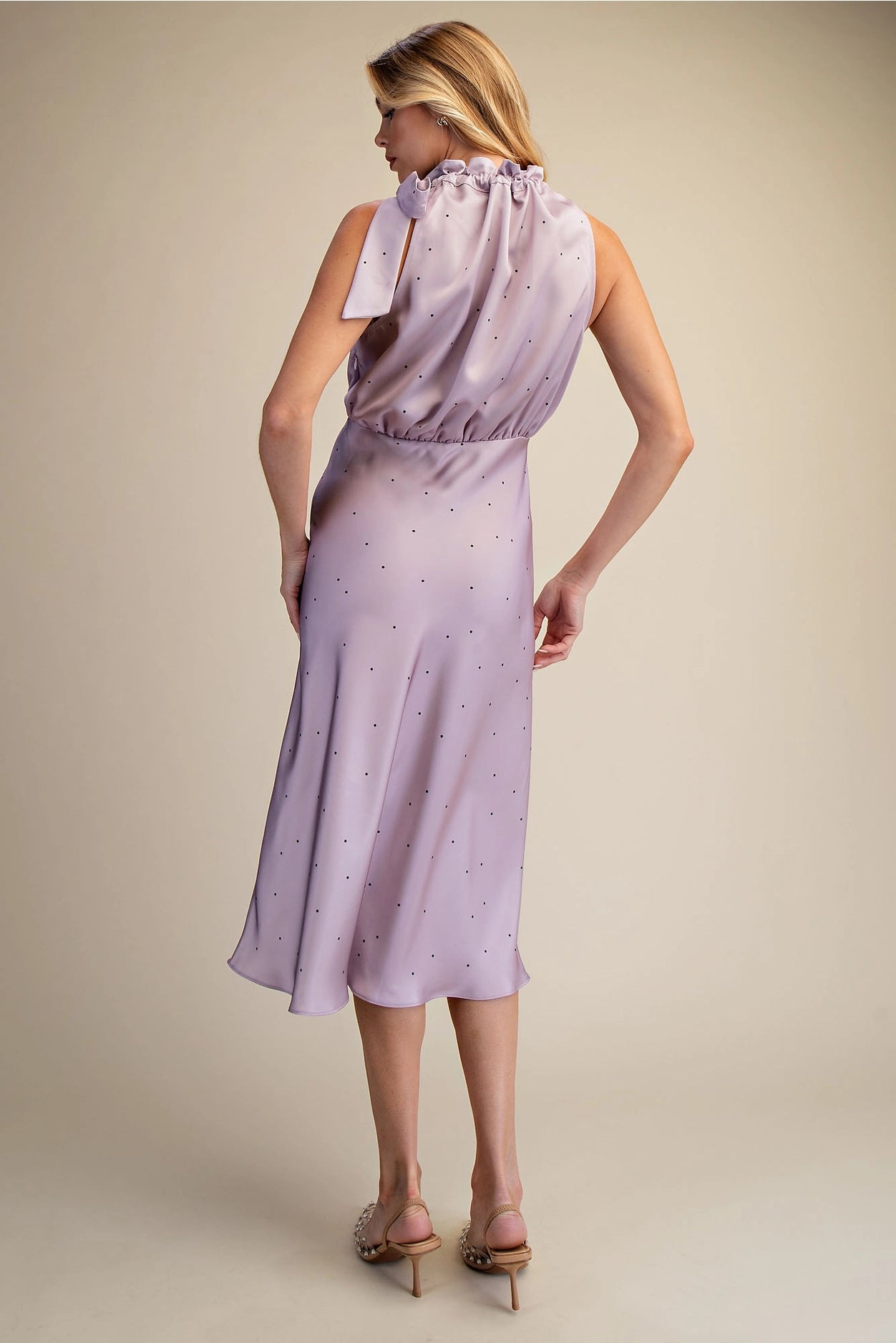 Ruffle Tie Neck Sleeveless Midi Dress with Tiny Polka Dot Design - Tapered to waist for an elegant fit.