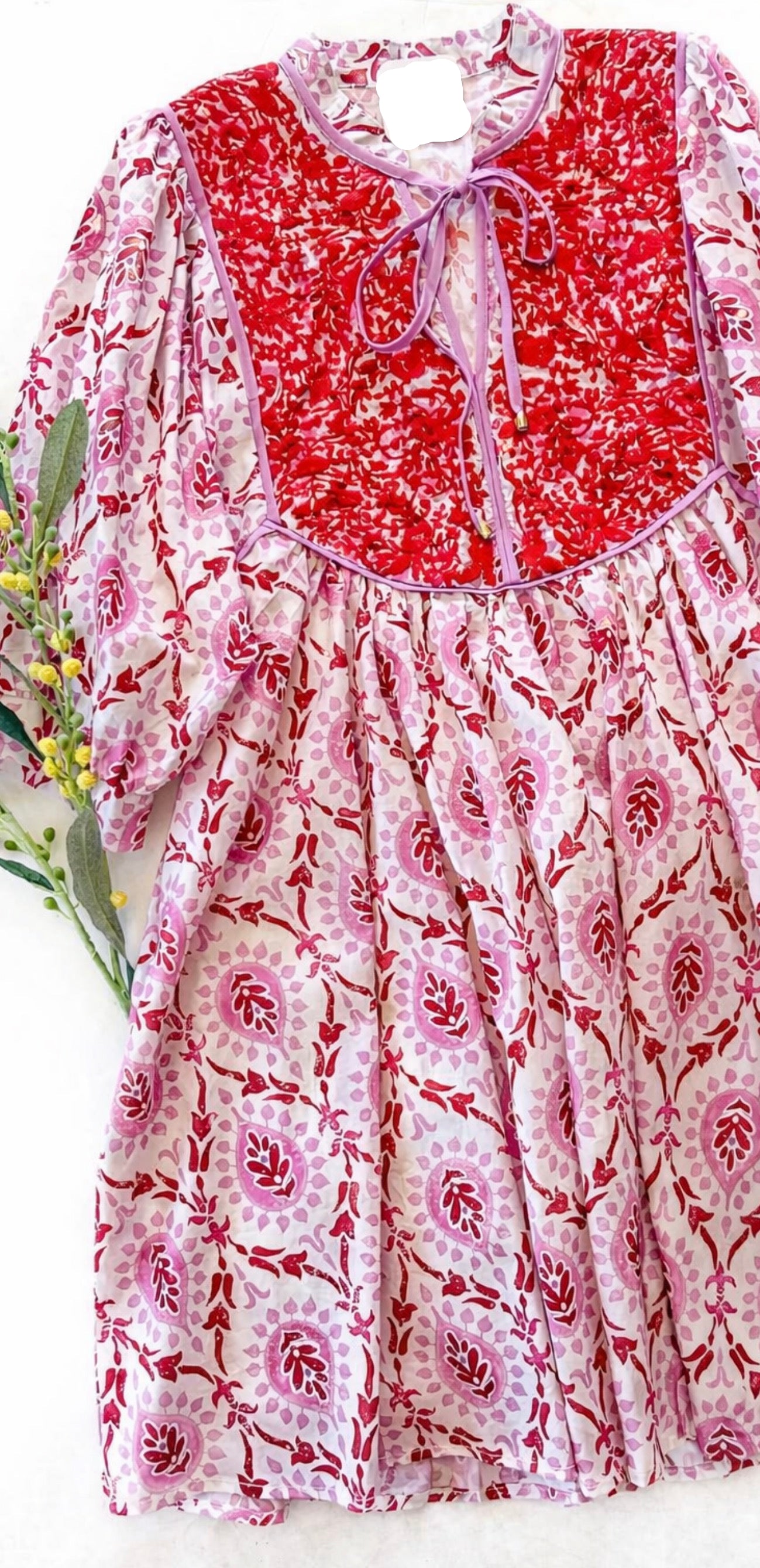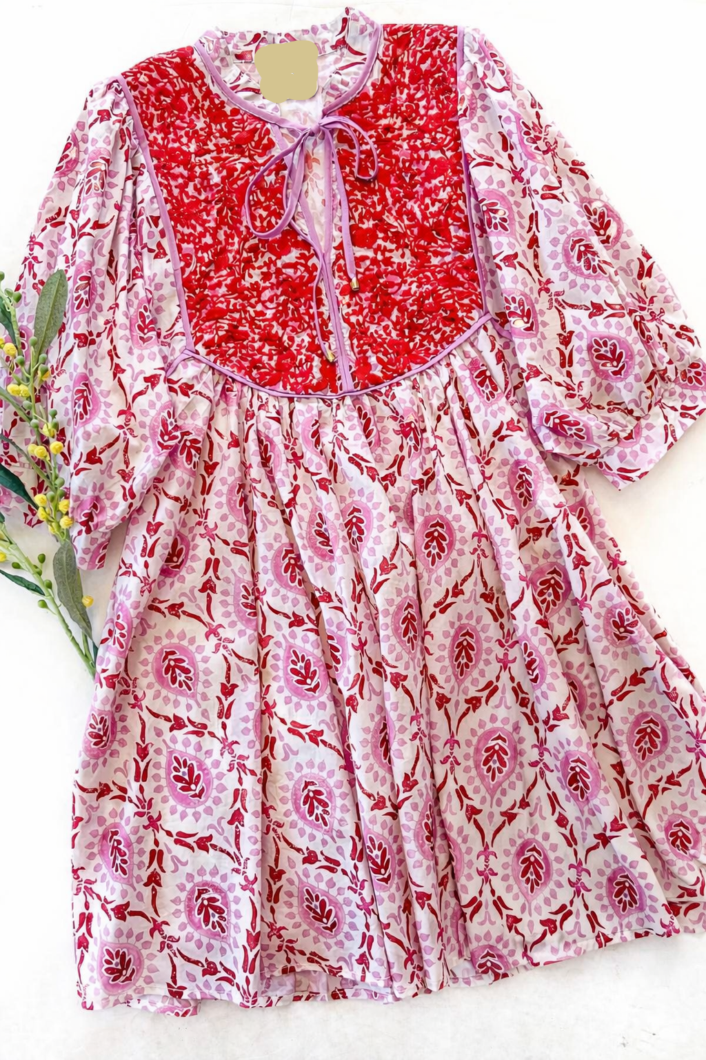 Mixed print puff half sleeve mini dress featuring contrast yoke with tie detail and piping trim. Side pockets. Lined. Woven. Non-sheer. Lightweight.
